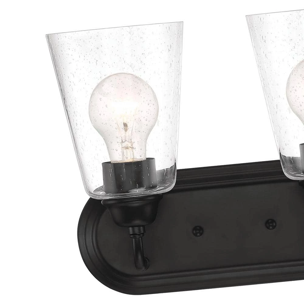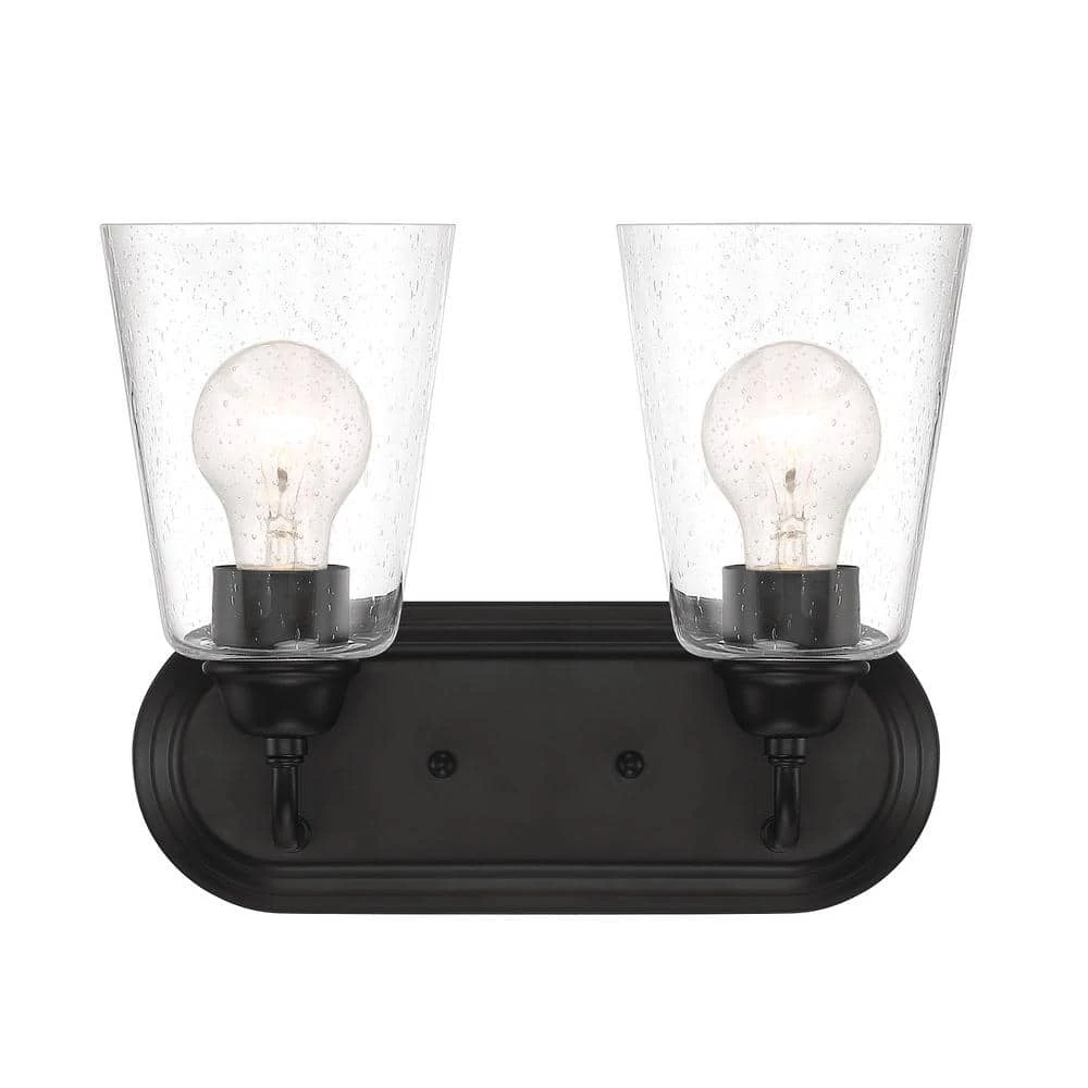 - Matte black 2-light vanity with clear seedy glass is part of the Zane collection
