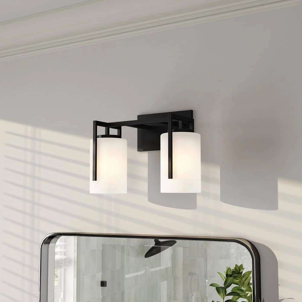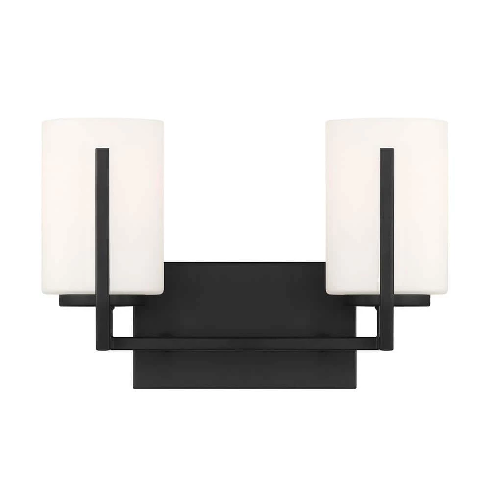 Straight lines and cylindrical shades evoke Modern art and architecture in Designers Fountain’s Cambria bath and vanity collection. The Matte Black finish contrasts nicely with the Etched Opal Glass shades. Made from durable steel for years of enjoyment and illumination.