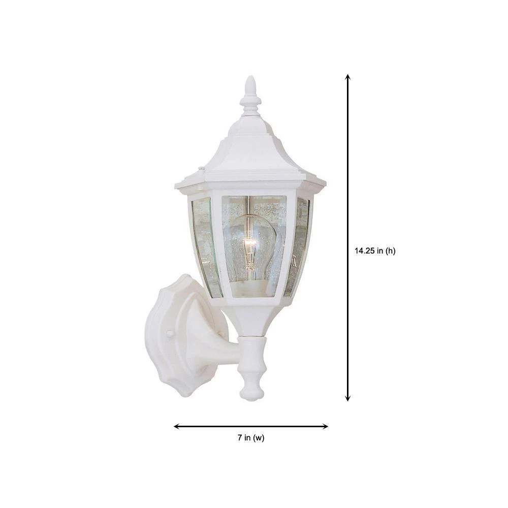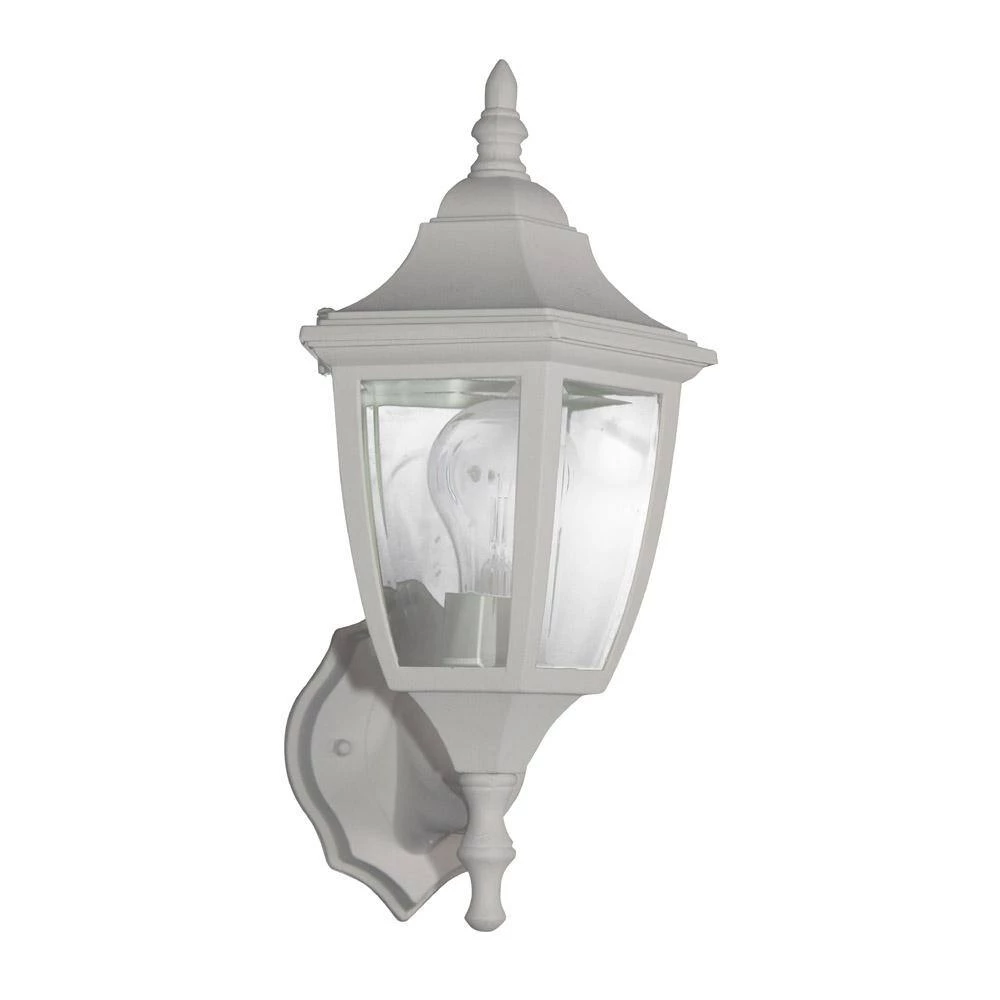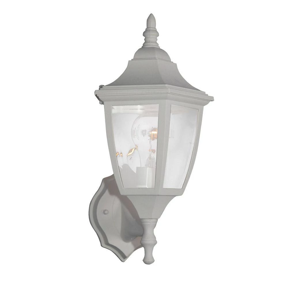 Waterbury outdoor lanterns feature a classic, elegant six sided design that complements the exterior decor of any home. The rounded clear glass works with the sharp lines and detailed backplate to provide a bold look from the fixture and a warm glow from the light. The solid white finish is treated to prevent pitting, tarnishing, corrosion and discoloration. The sturdy, weather resistant cast aluminum construction and waterproof seal protect the lantern from harsh outdoor elements to ensure the long life of the fixture. These outdoor lanterns install easily and deliver welcoming, safe and reliable exterior lighting.