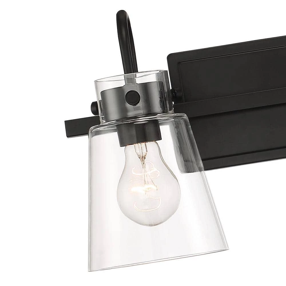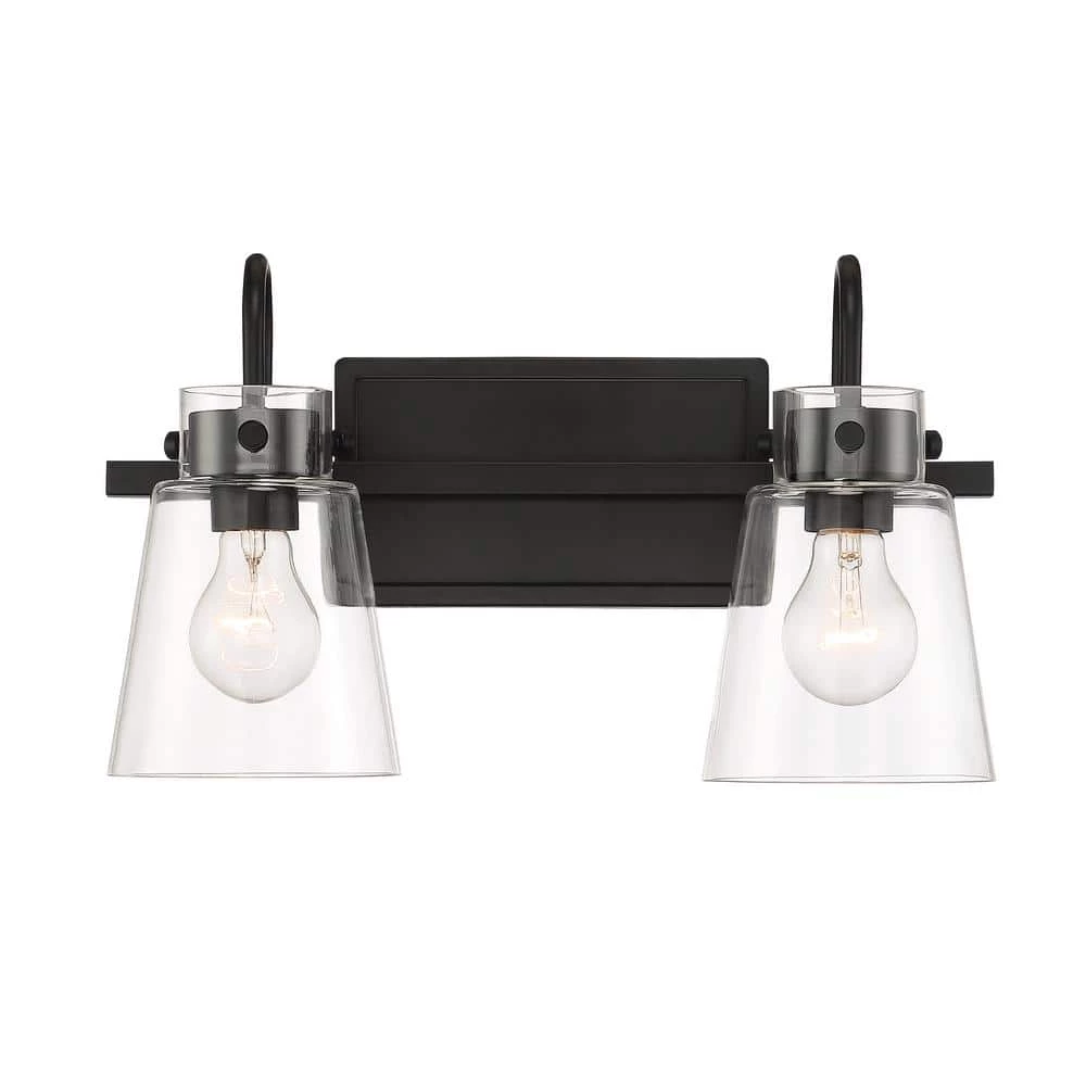 - Matte black 2-light vanity with clear glass shade is part of the Inwood collection