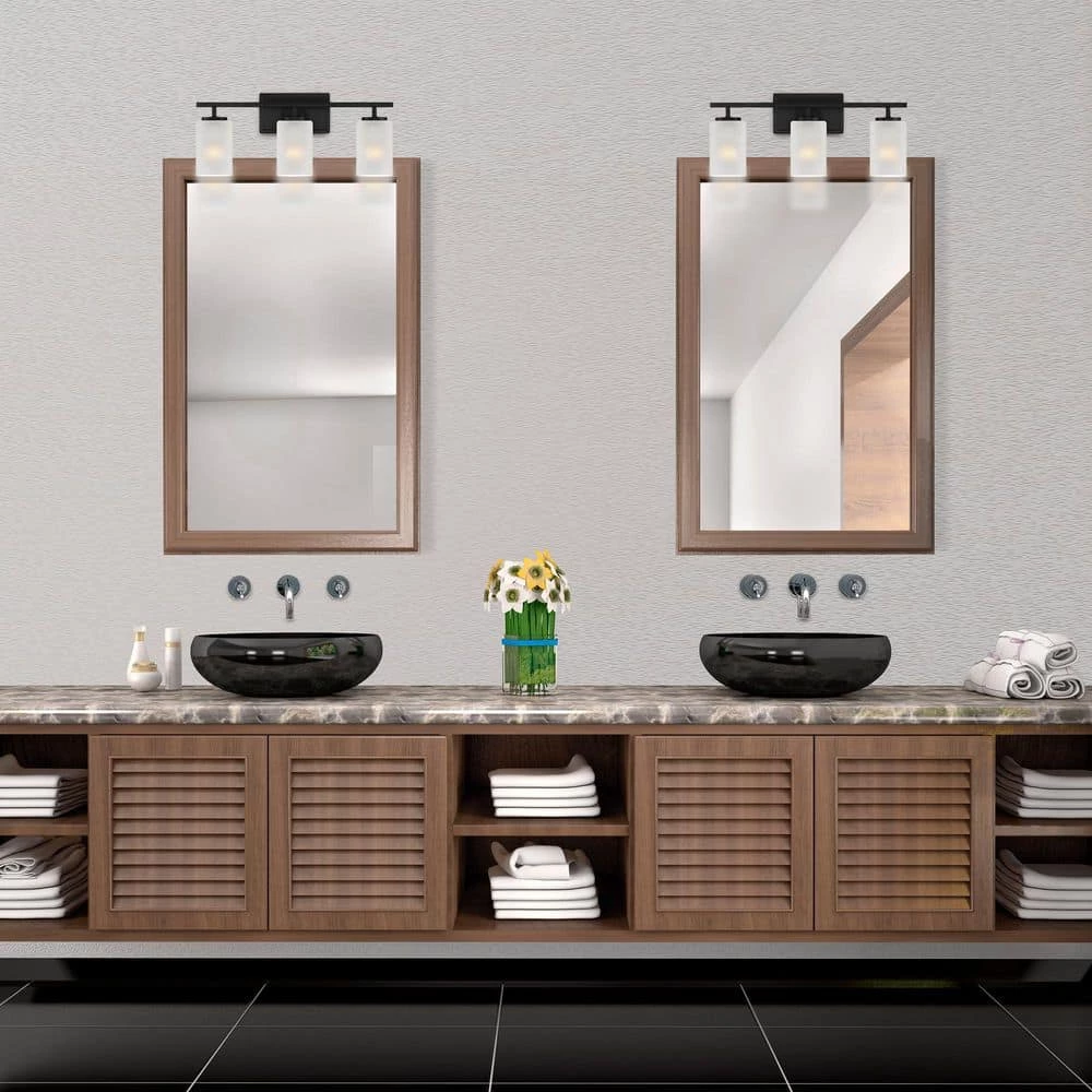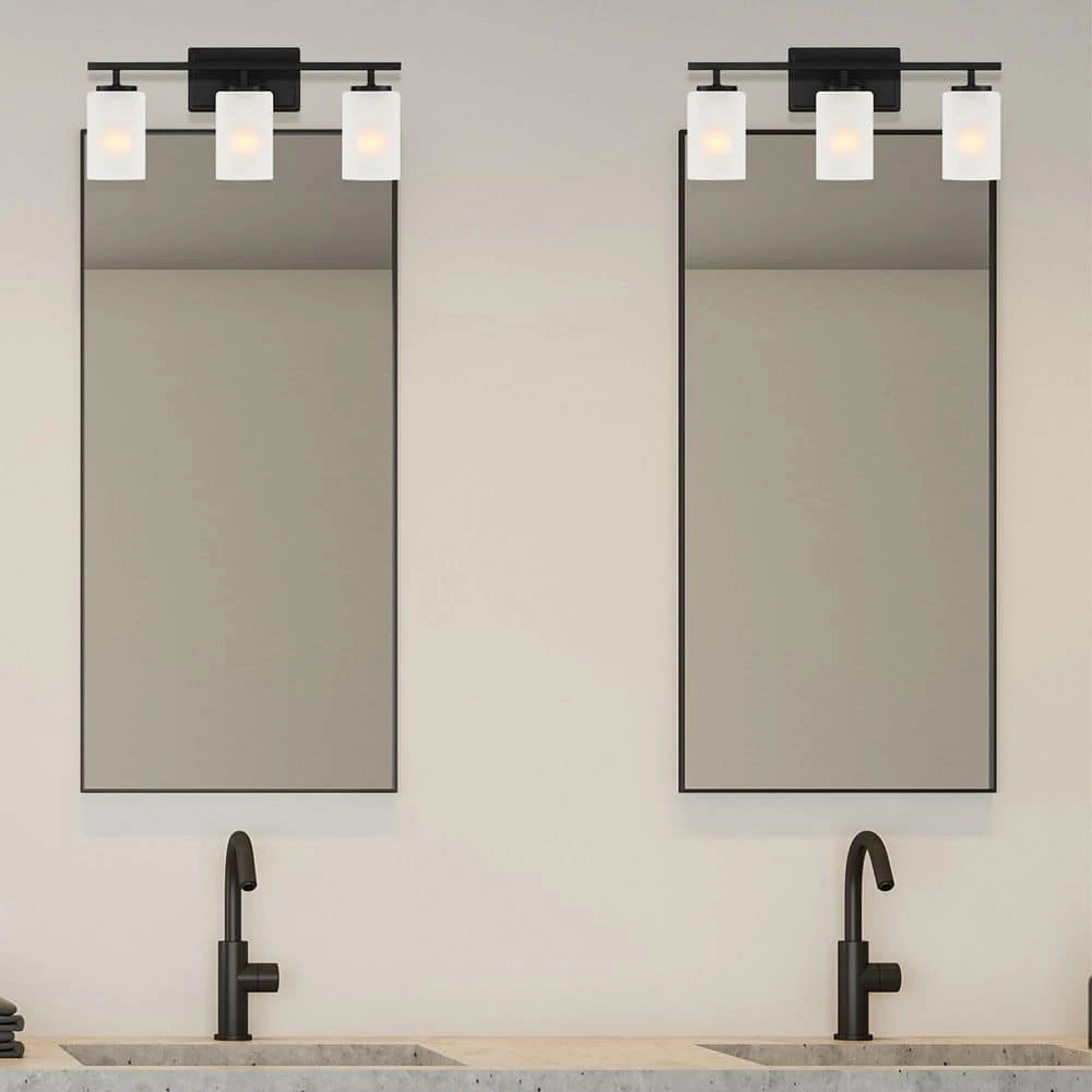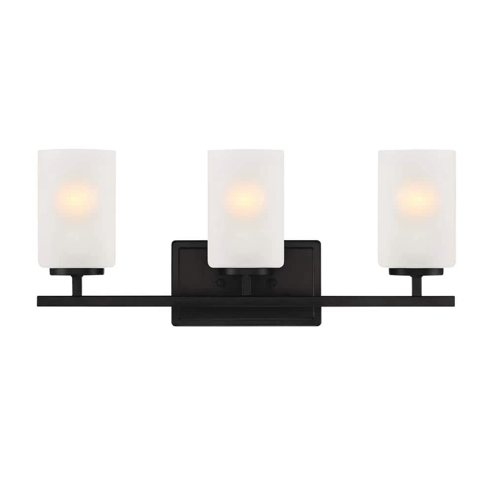 - Matte black 3-light vanity with etched glass is part of the Carmine collection