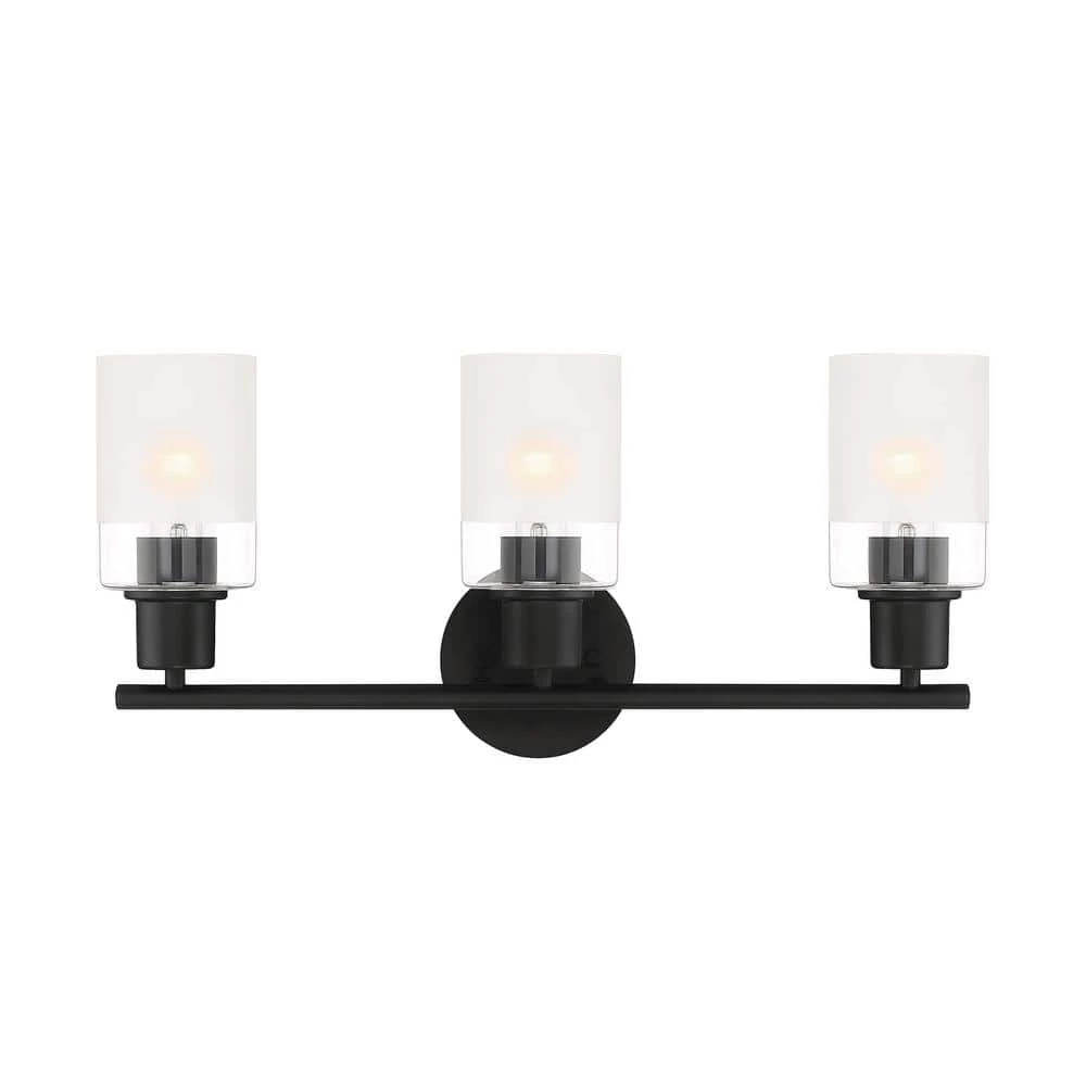 - Matte black 3-light vanity with clear and etched glass is part of the Cedar Lane collection