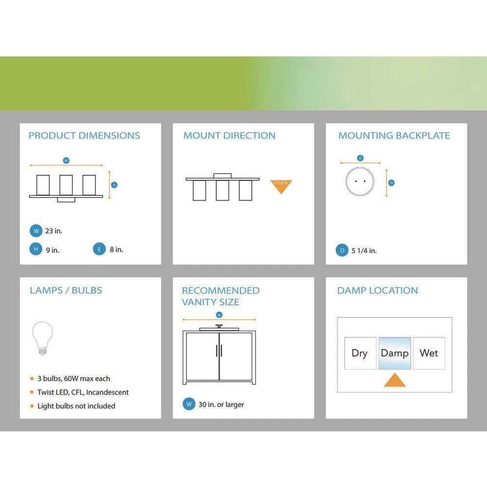 - Fixture dimension: 23 in. W x 9 in. H x 8 in. D