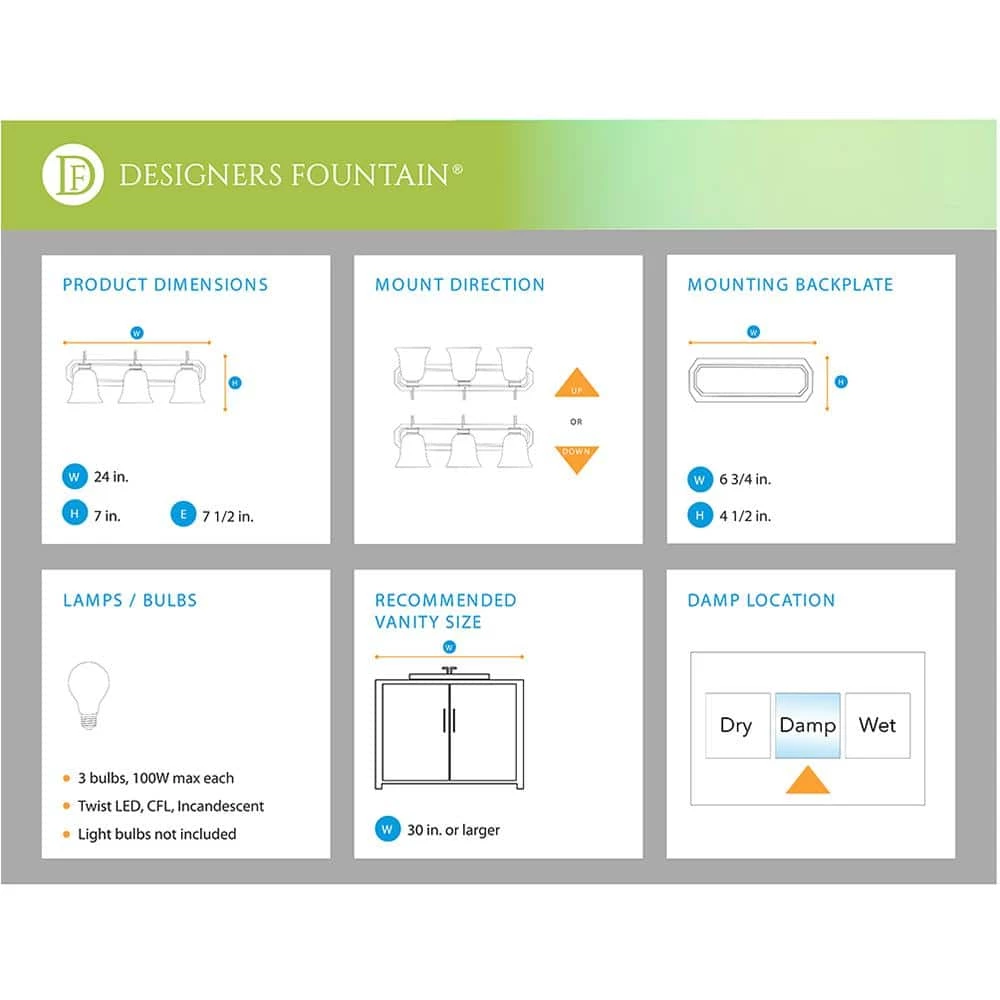 Illuminating in style. The Kelvin collection is bold in its simplicity. Pairs perfectly with Designers Fountain Wiz Colors A19 lamps for that burst of color and excitement. This wall mounted light is designed for easy installation in damp locations such as bathrooms and vanity areas. It is quality built to last for years to come.
