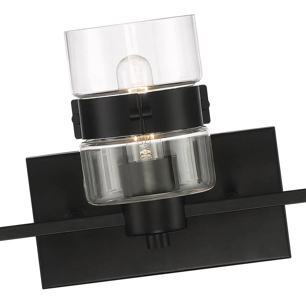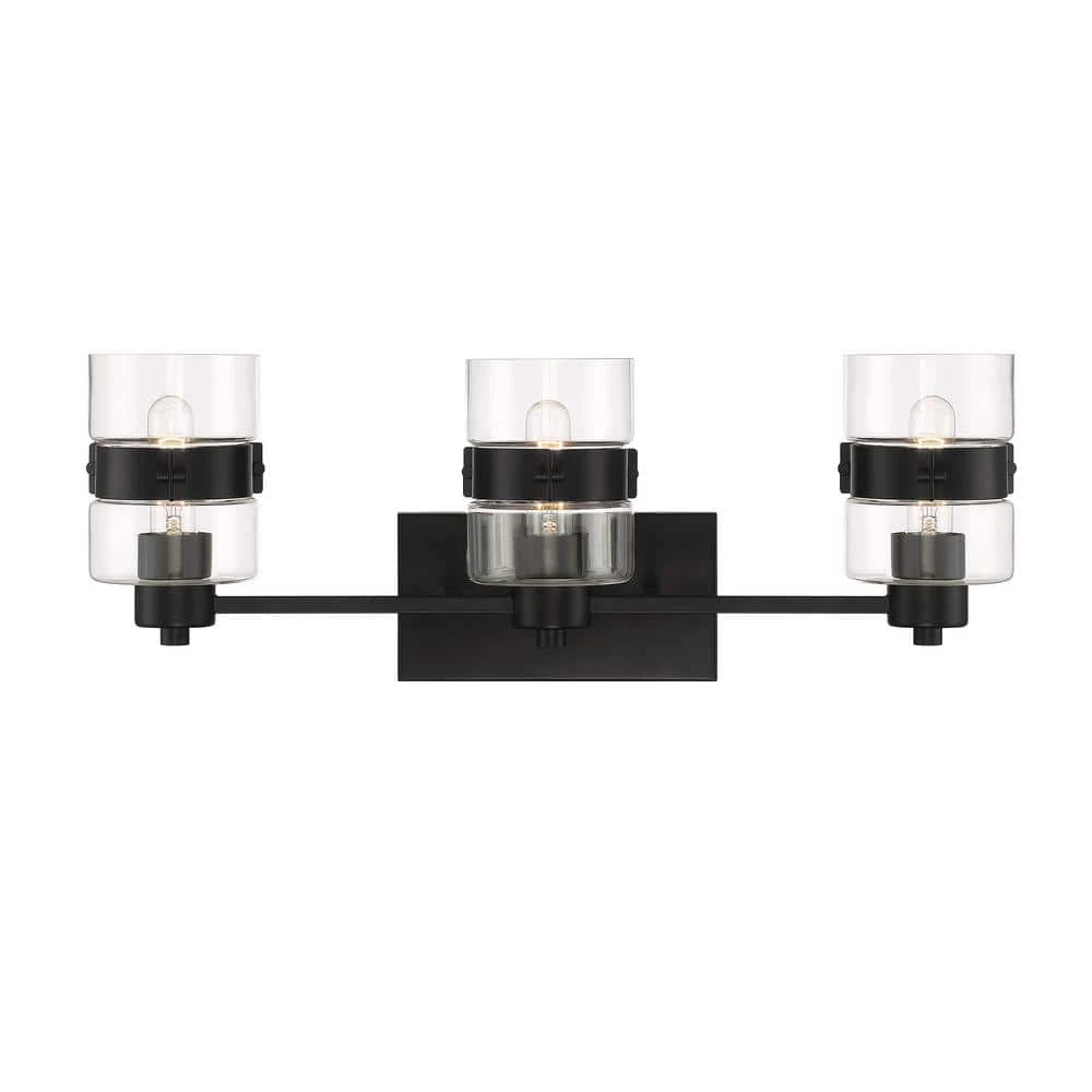 - Matte black 3-light vanity with clear glass shade is part of the Midnight LA collection