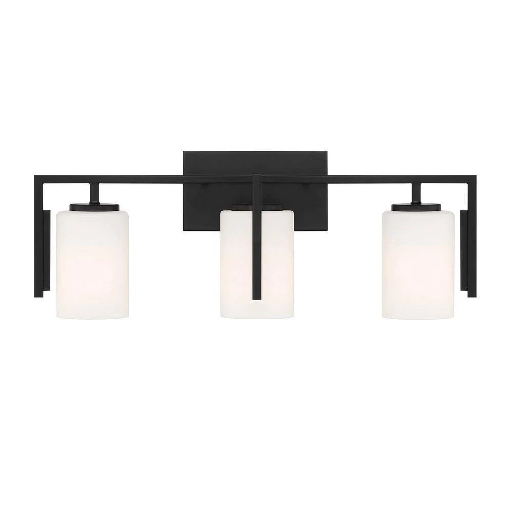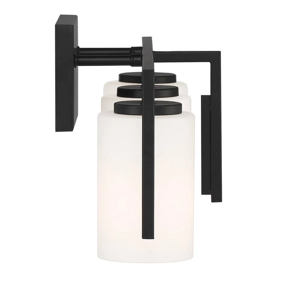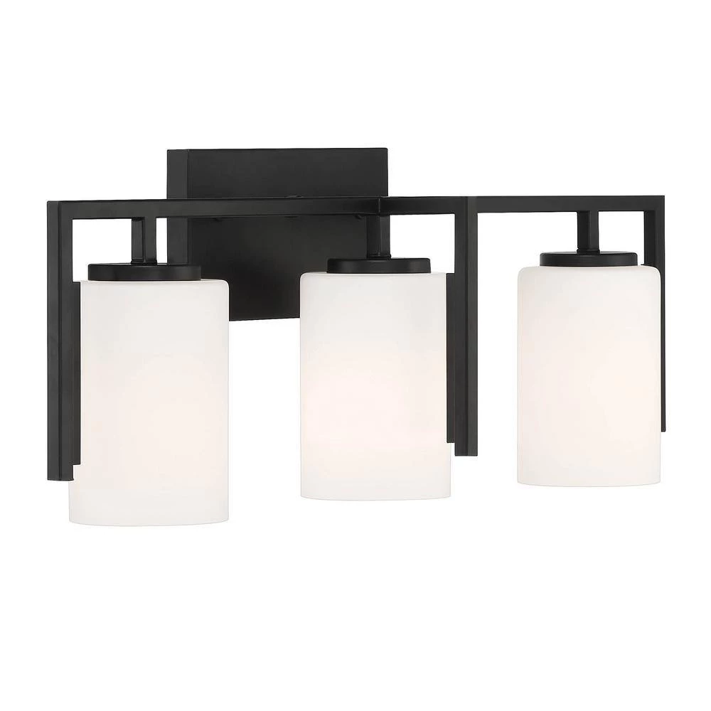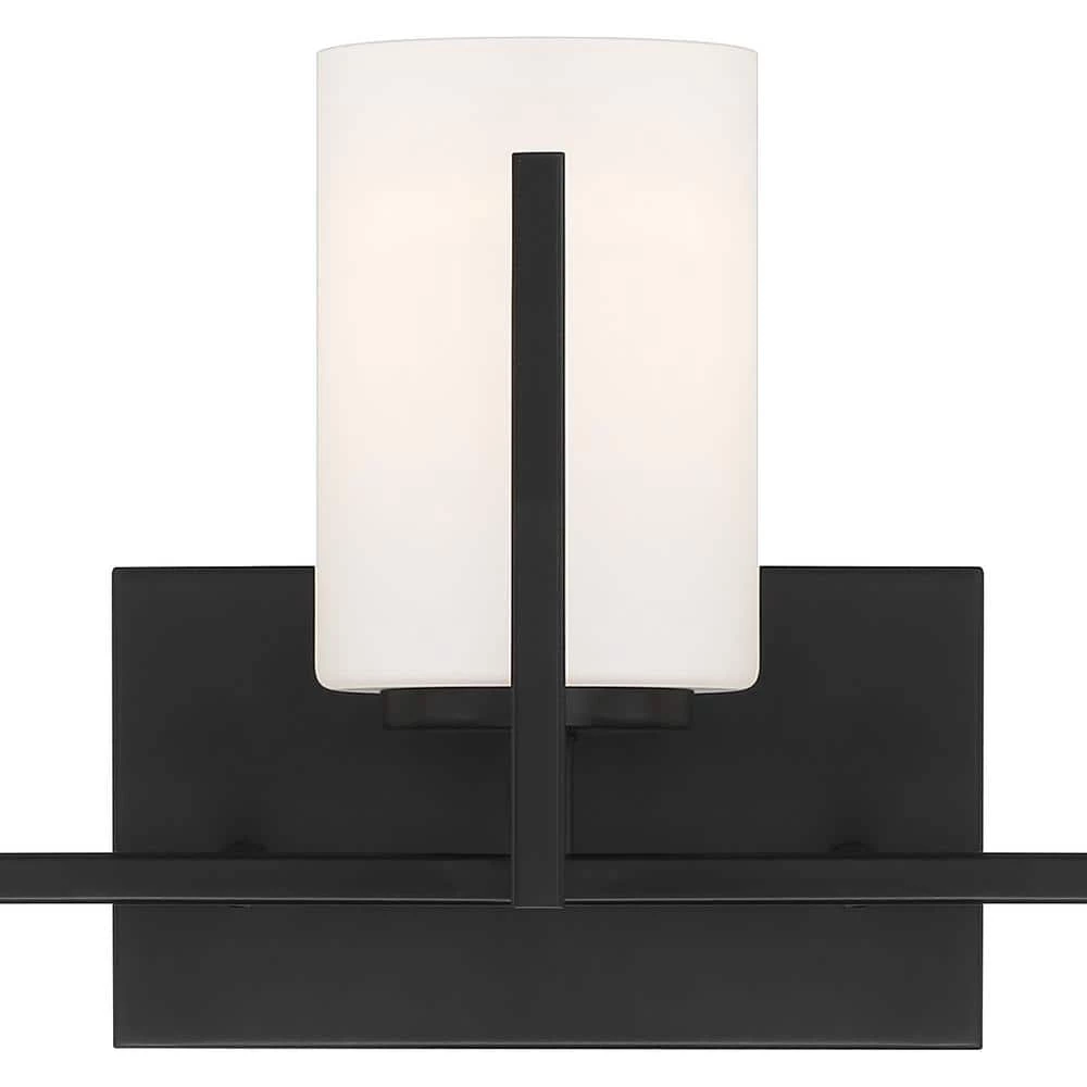 Straight lines and cylindrical shades evoke Modern art and architecture in Designers Fountain’s Cambria bath and vanity collection. The Matte Black finish contrasts nicely with the Etched Opal Glass shades. Made from durable steel for years of enjoyment and illumination.