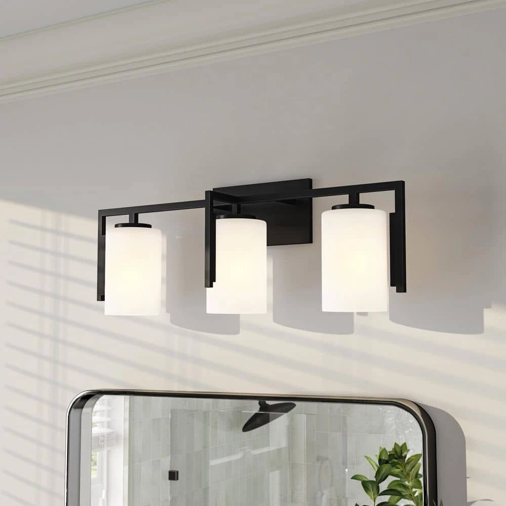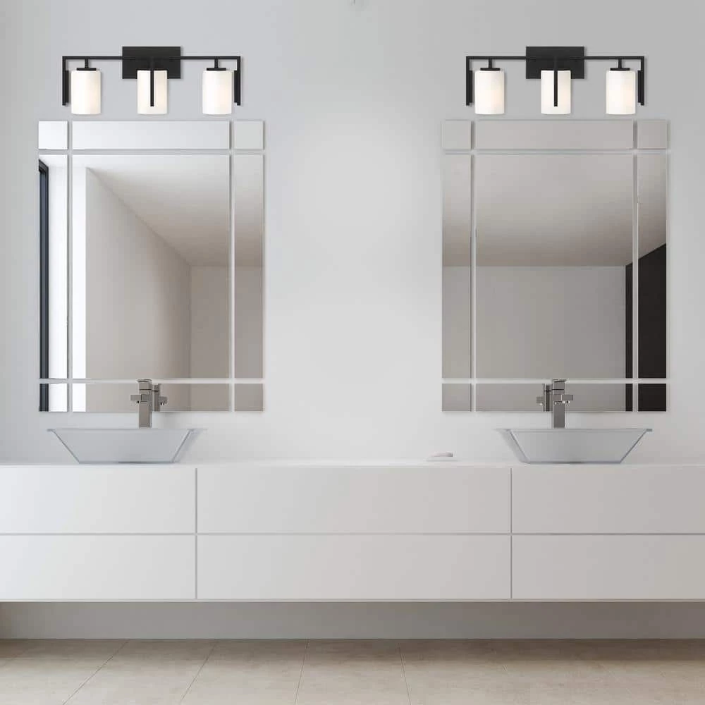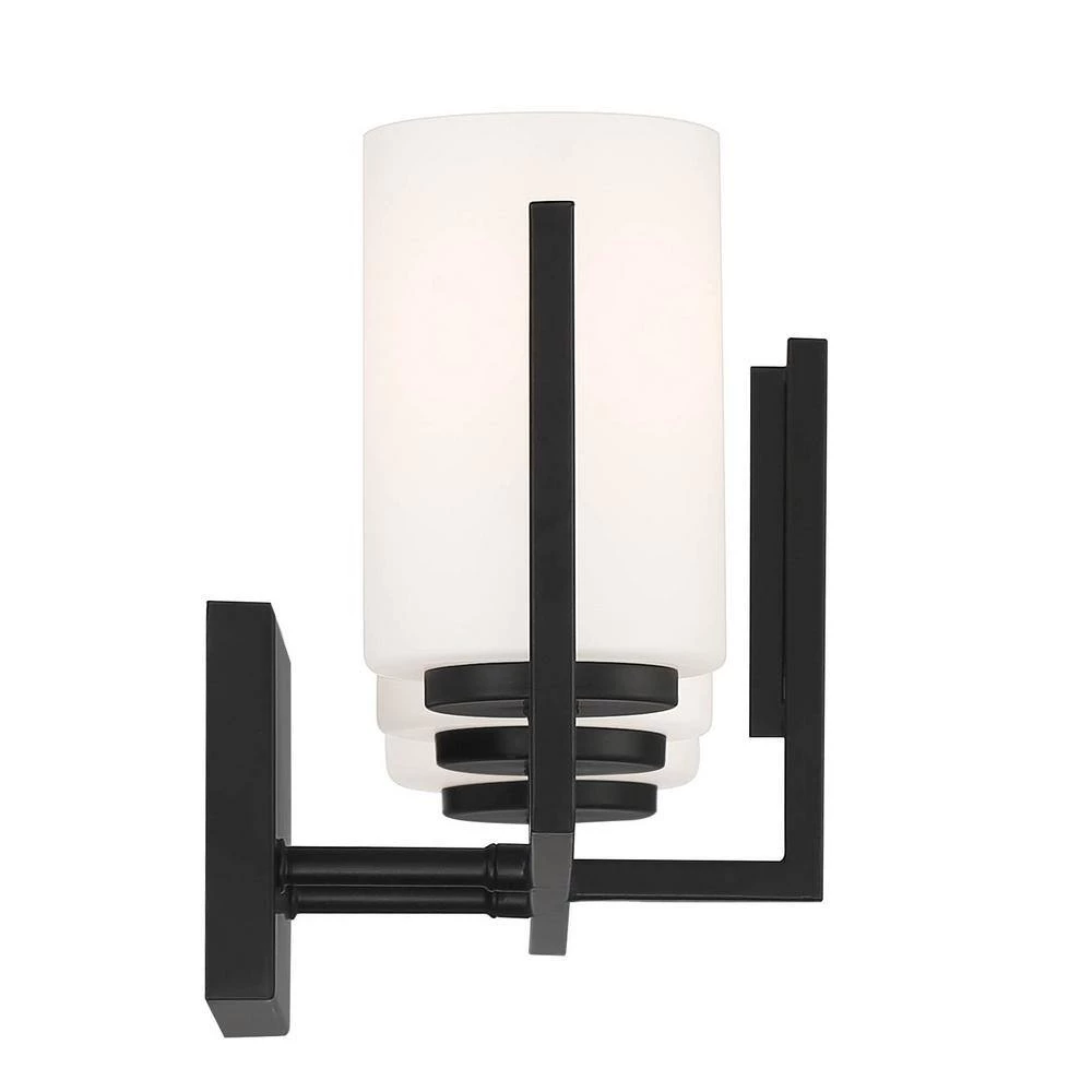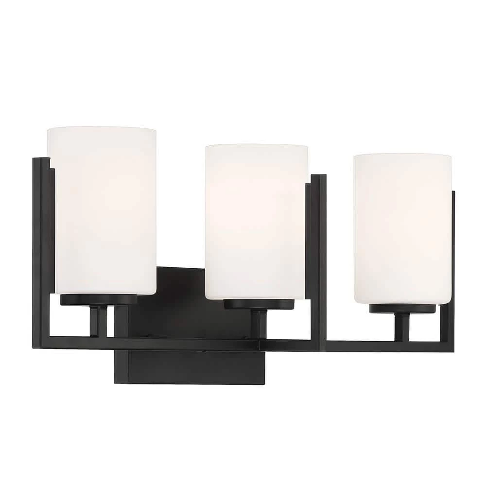 Straight lines and cylindrical shades evoke Modern art and architecture in Designers Fountain’s Cambria bath and vanity collection. The Matte Black finish contrasts nicely with the Etched Opal Glass shades. Made from durable steel for years of enjoyment and illumination.