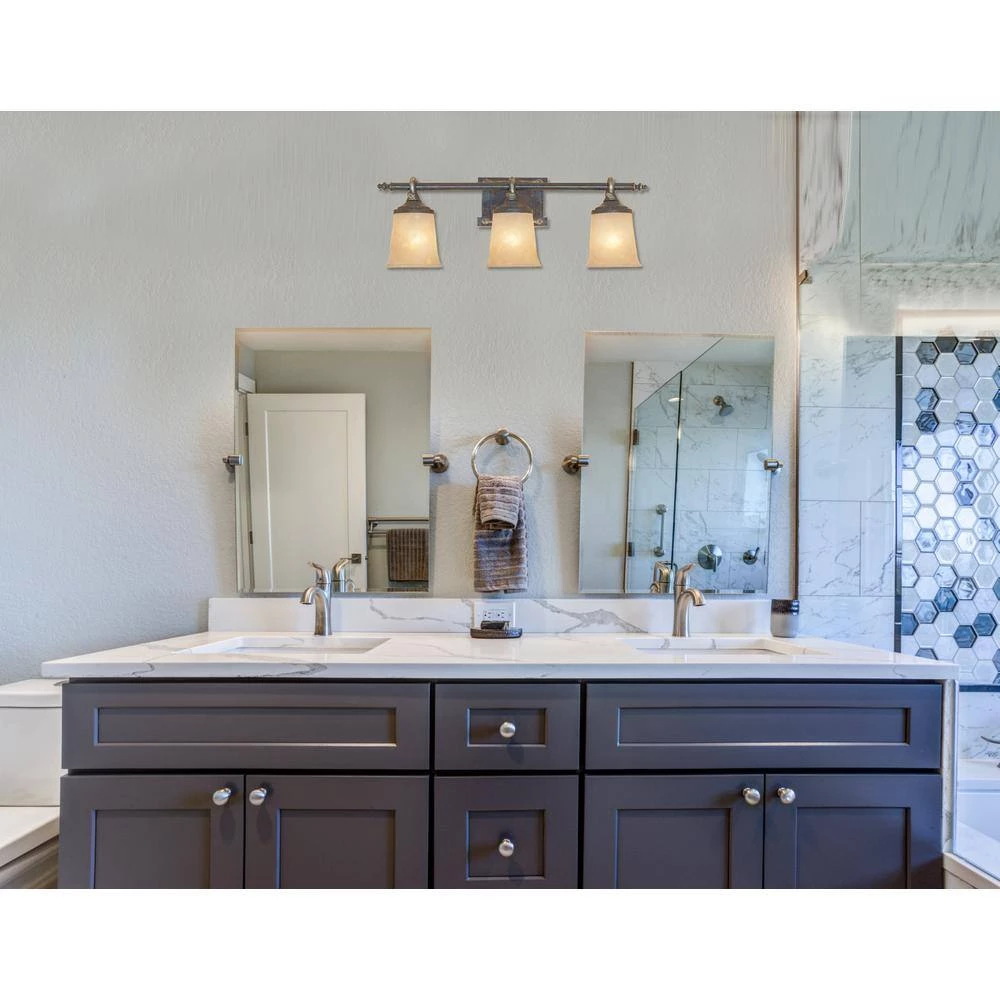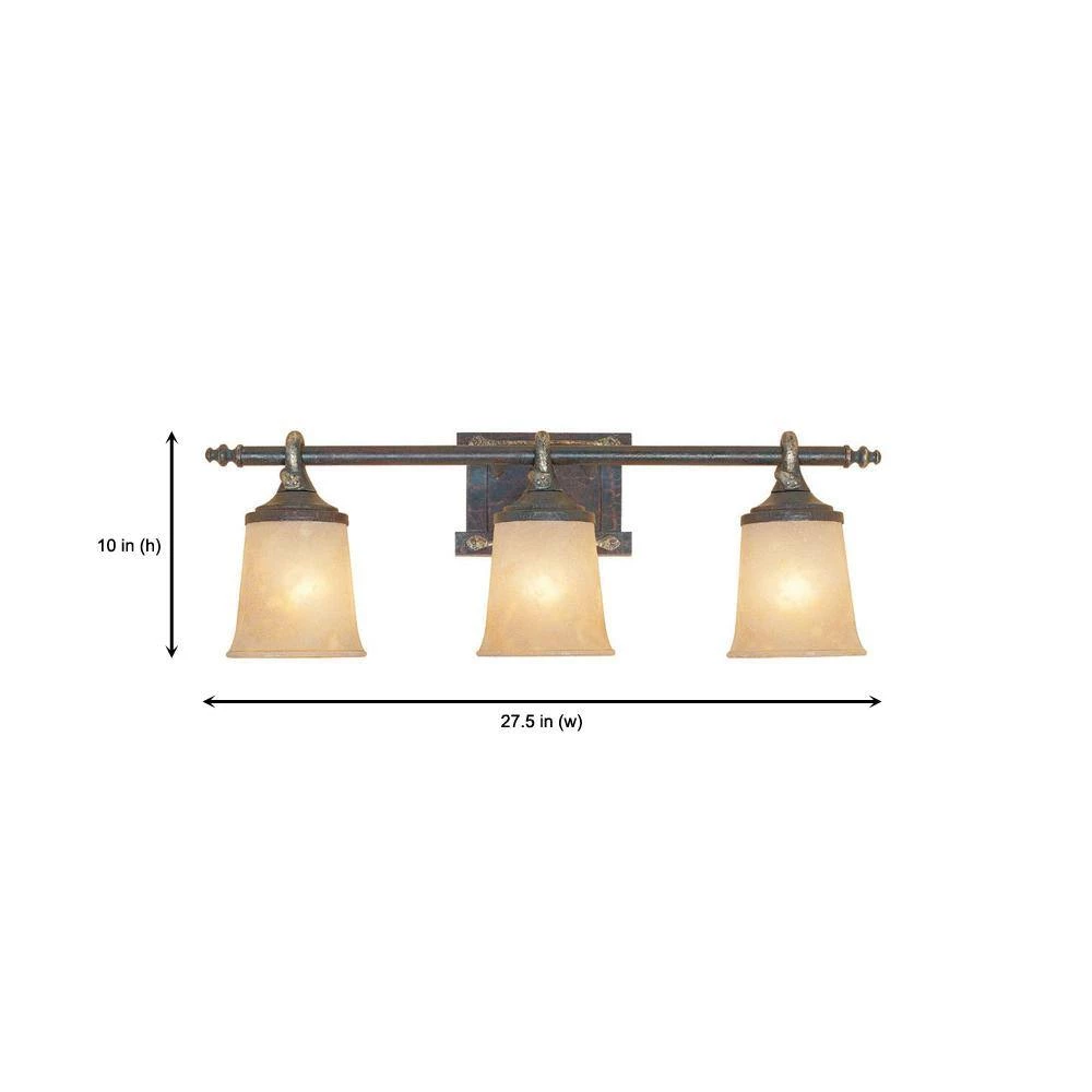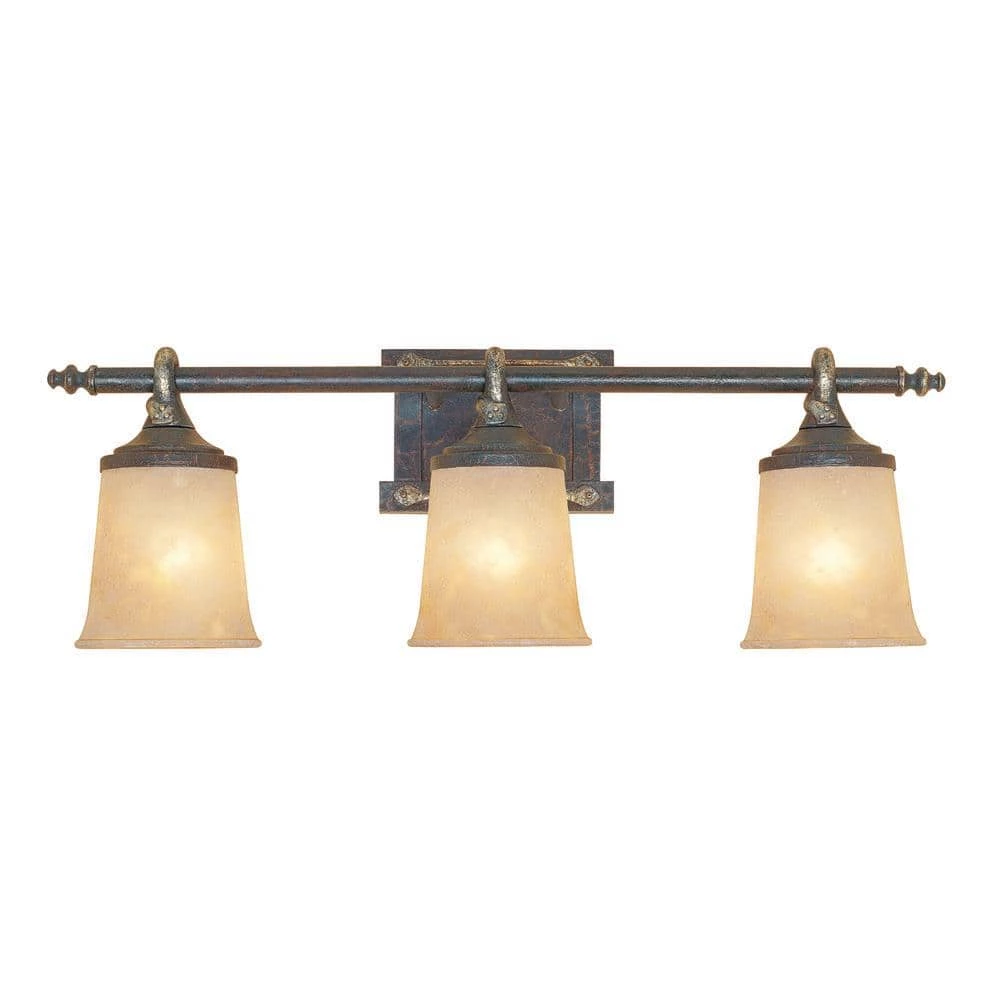 El Paso wall vanities are specially designed with a unique style to complement the interior of any home. This collection features a weathered saddle finish and hand forged ironwork detailing that gives a rustic, Spanish look to the fixture. The satin crepe glass shades add elegance and a warm, welcoming diffuse to the light. The durable steel construction ensures that this vanity will continue to perform well and look great for years to come. These vanities install easily in the up or down position and use traditional incandescent bulbs.