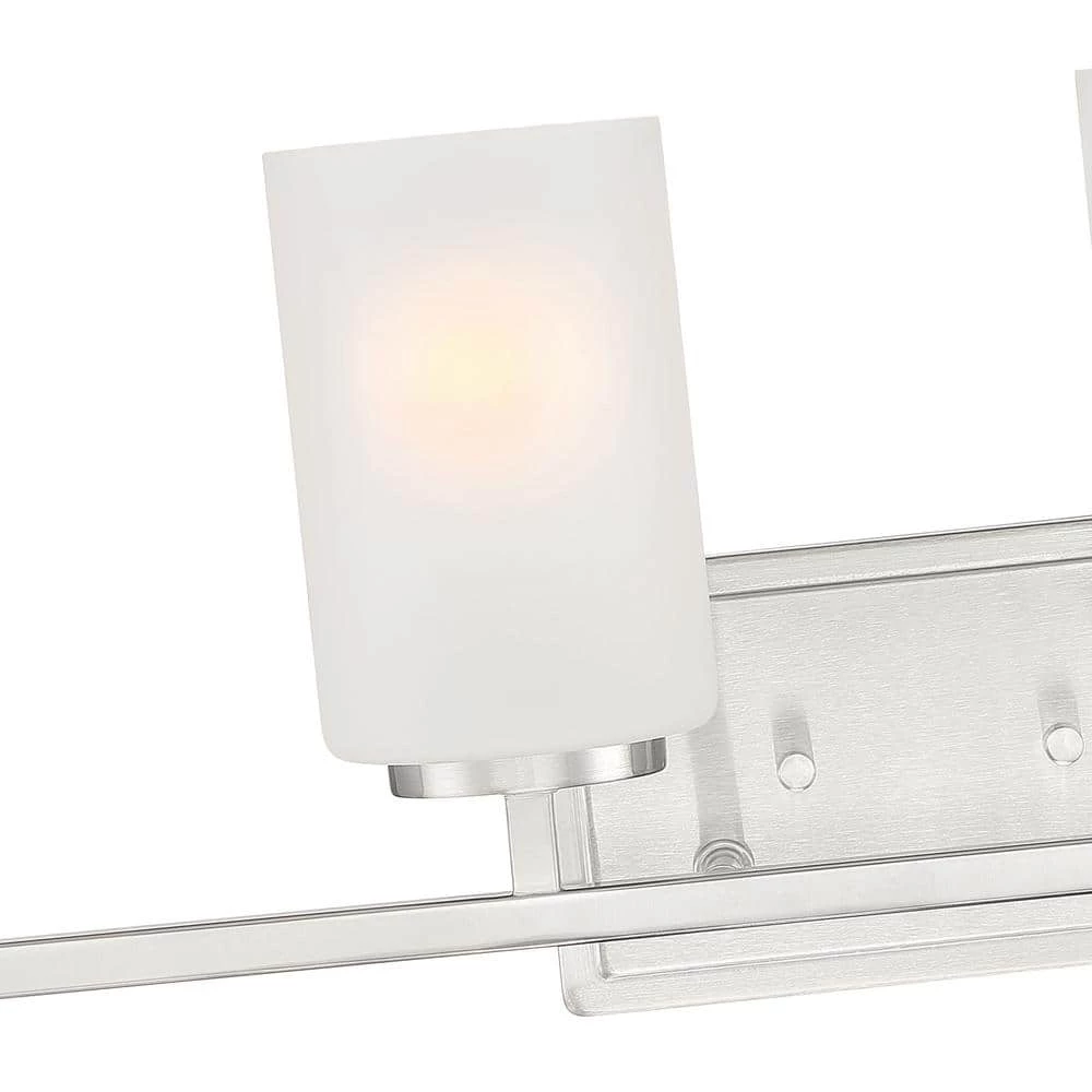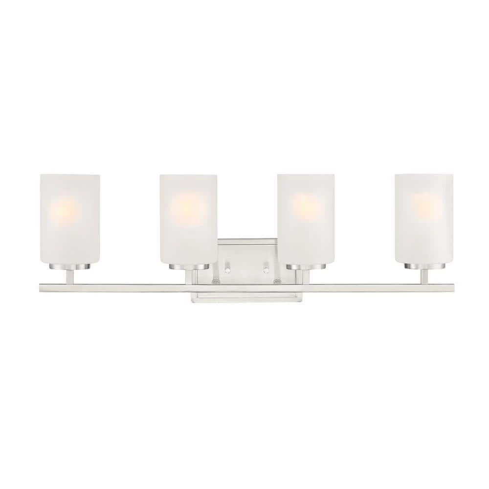 - brushed nickel 4-light vanity with etched glass is part of the Carmine collection