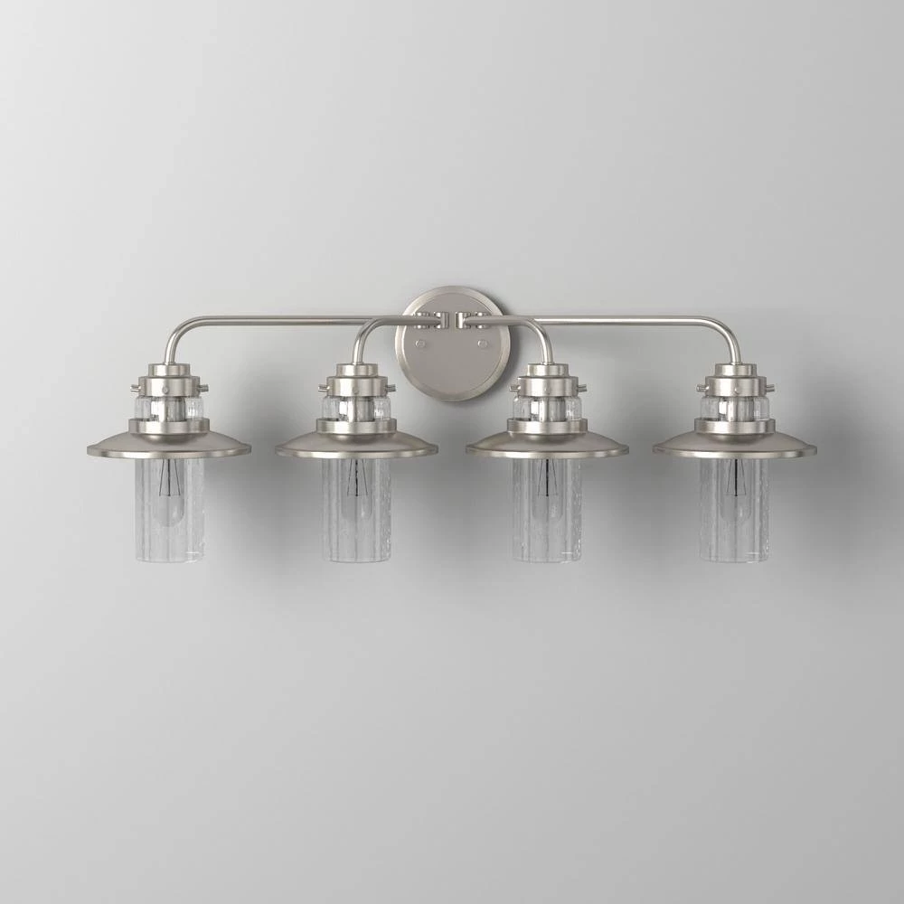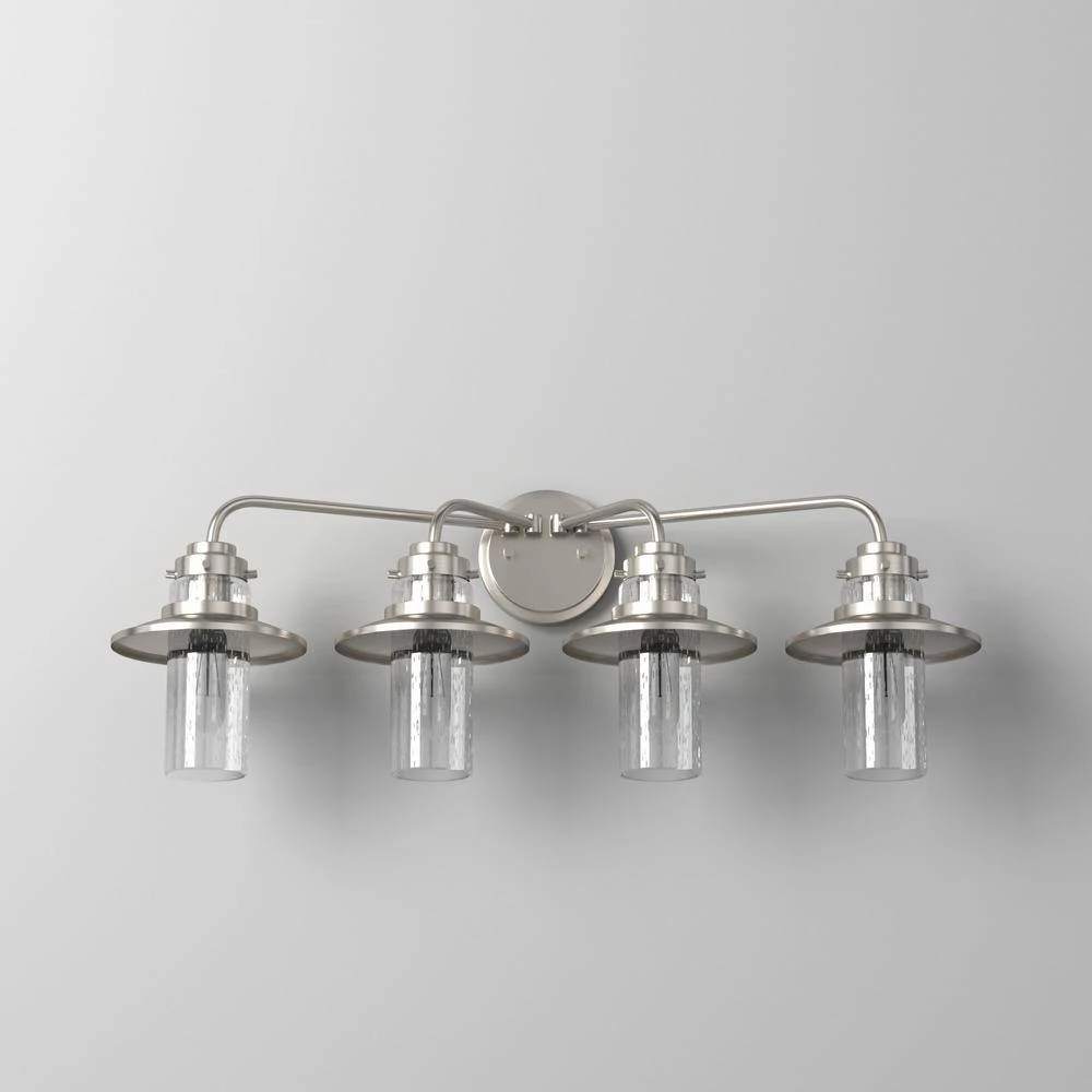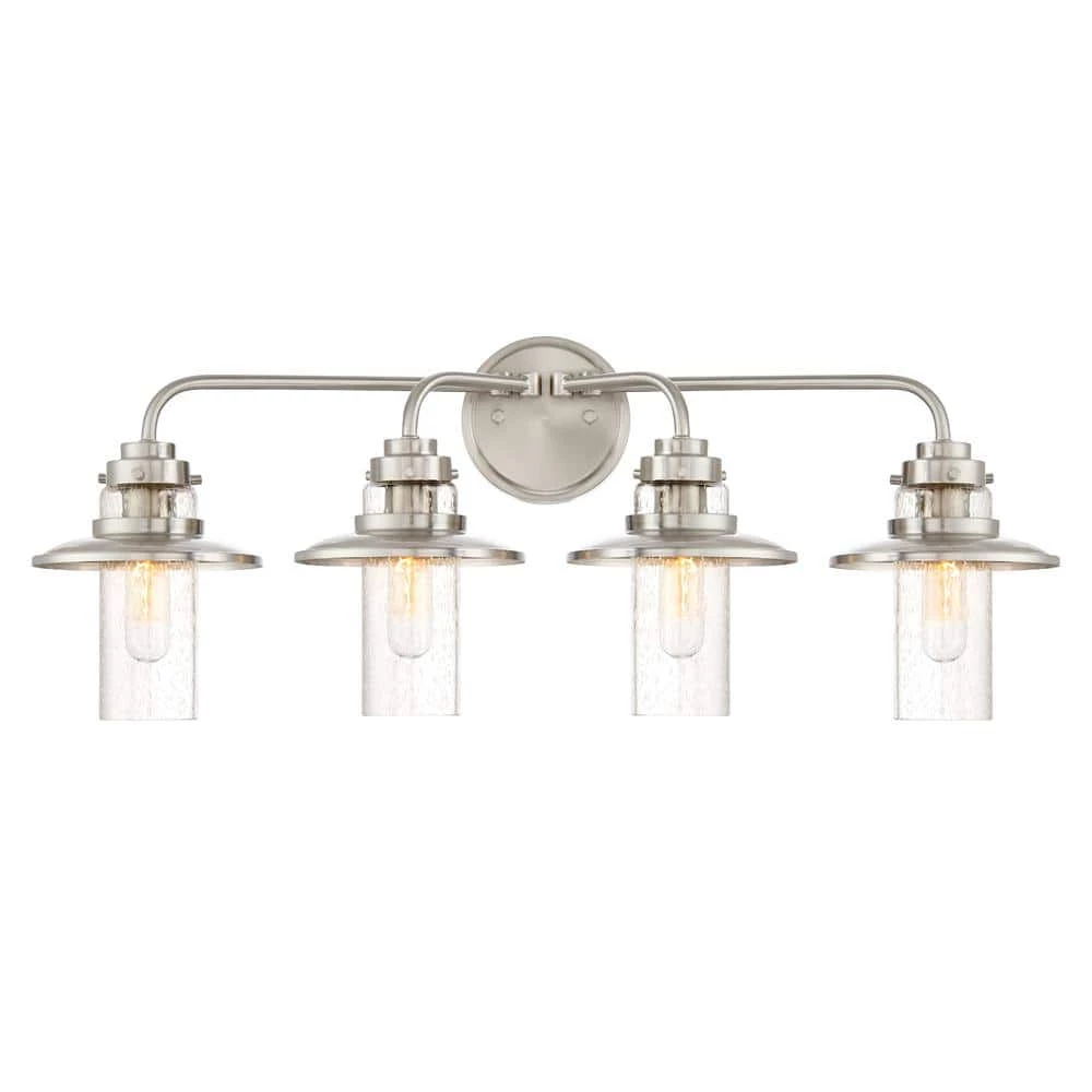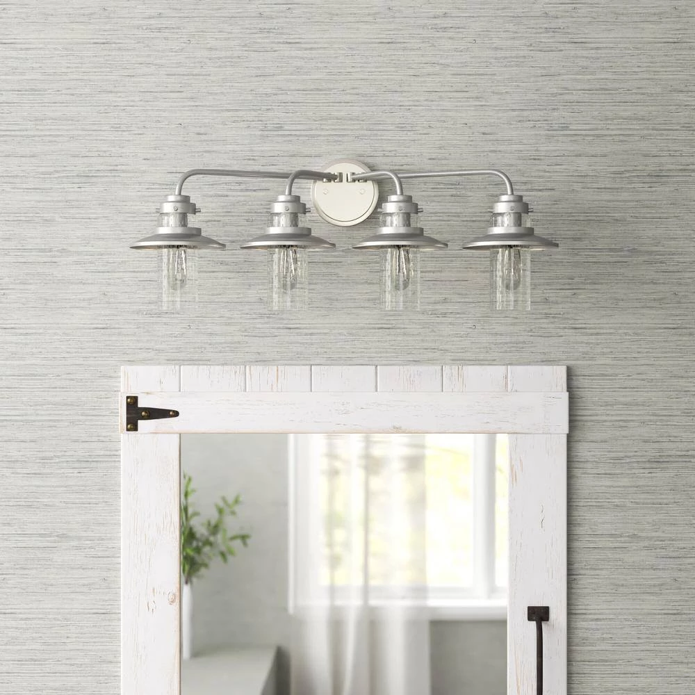 The Dover collection redefines farmhouse luxury while retaining farmhouse charm. With its satin platinum finish and clean lines, this 4-light bath bar will be the star of your bathroom. The clear seedy shades highlight the vintage style bulbs and create a unique pattern of light around the fixture. These bathroom lights are designed for damp locations such as over sinks in bathrooms and vanity areas, and they can be mounted with the shades facing up or down.