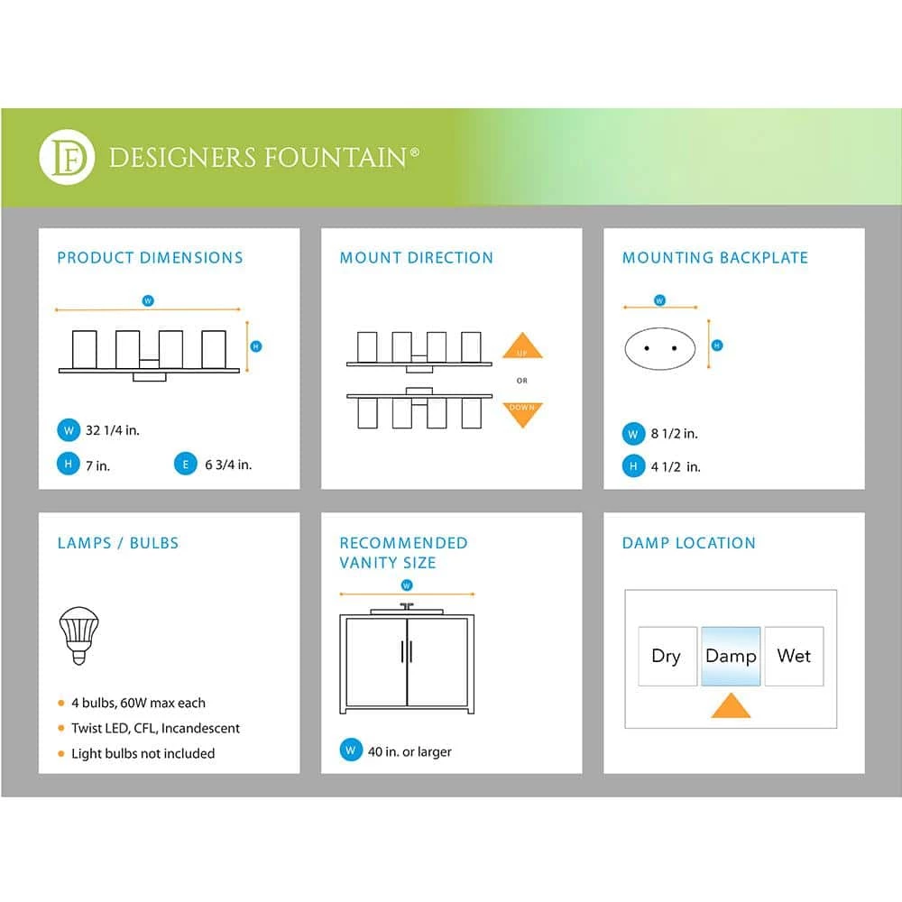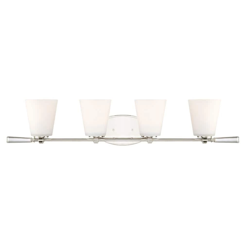 A stunning silhouette with a distinct modern vibe, the Abree collection delivers clean design with a stylish hint of sparkle. With its polished nickel finish and unique accents, this 4-light bath bar will be the star of your bathroom. The frosted white shades deliver soft light evenly throughout your vanity area. These bathroom lights are designed for damp locations such as over sinks in bathrooms and vanity areas, and they can be mounted with the shades facing up or down.