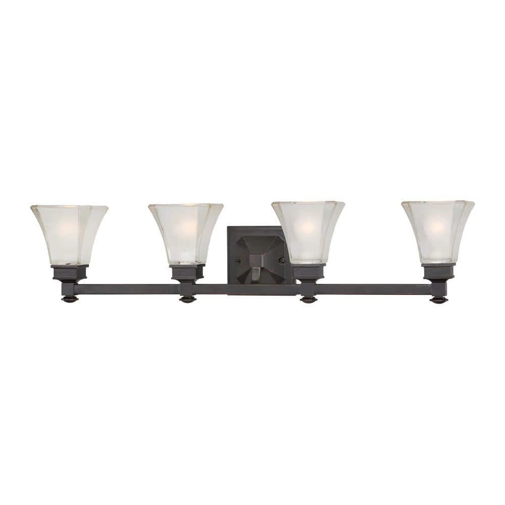 The Canterbury Collection comes in Biscayne Bronze with Satin Etched glass. This Transitional Canterbury 4 Light Bath Bar will complement the decor in any room of your home. Made with solid steel construction to look great and last for years to come.