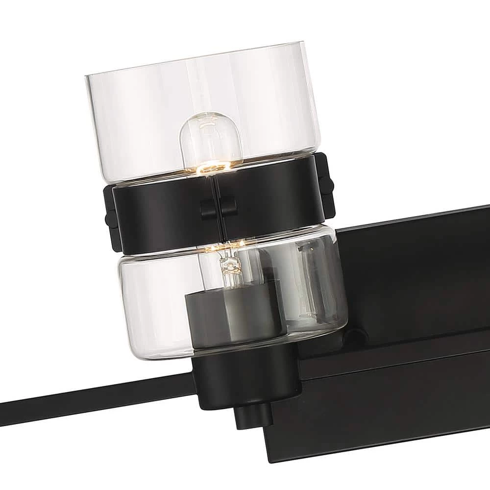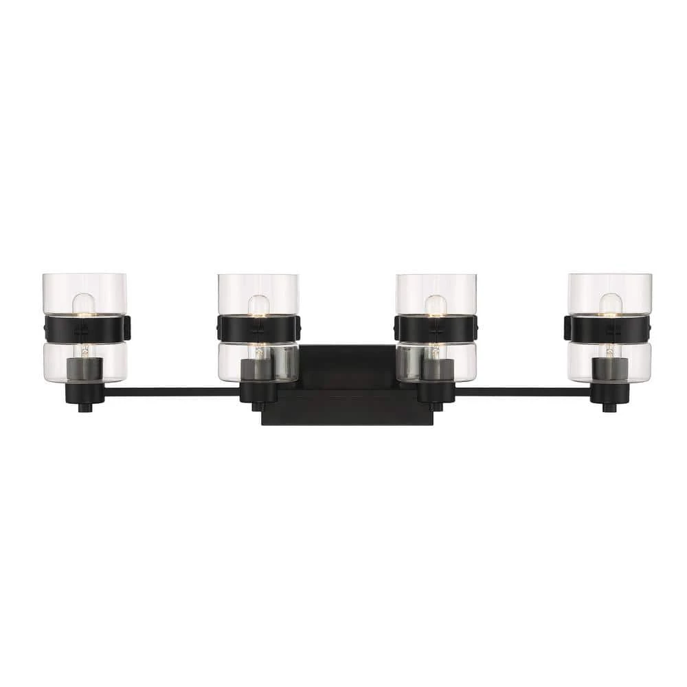 - Matte black 4-light vanity with clear glass shade is part of the Midnight LA collection