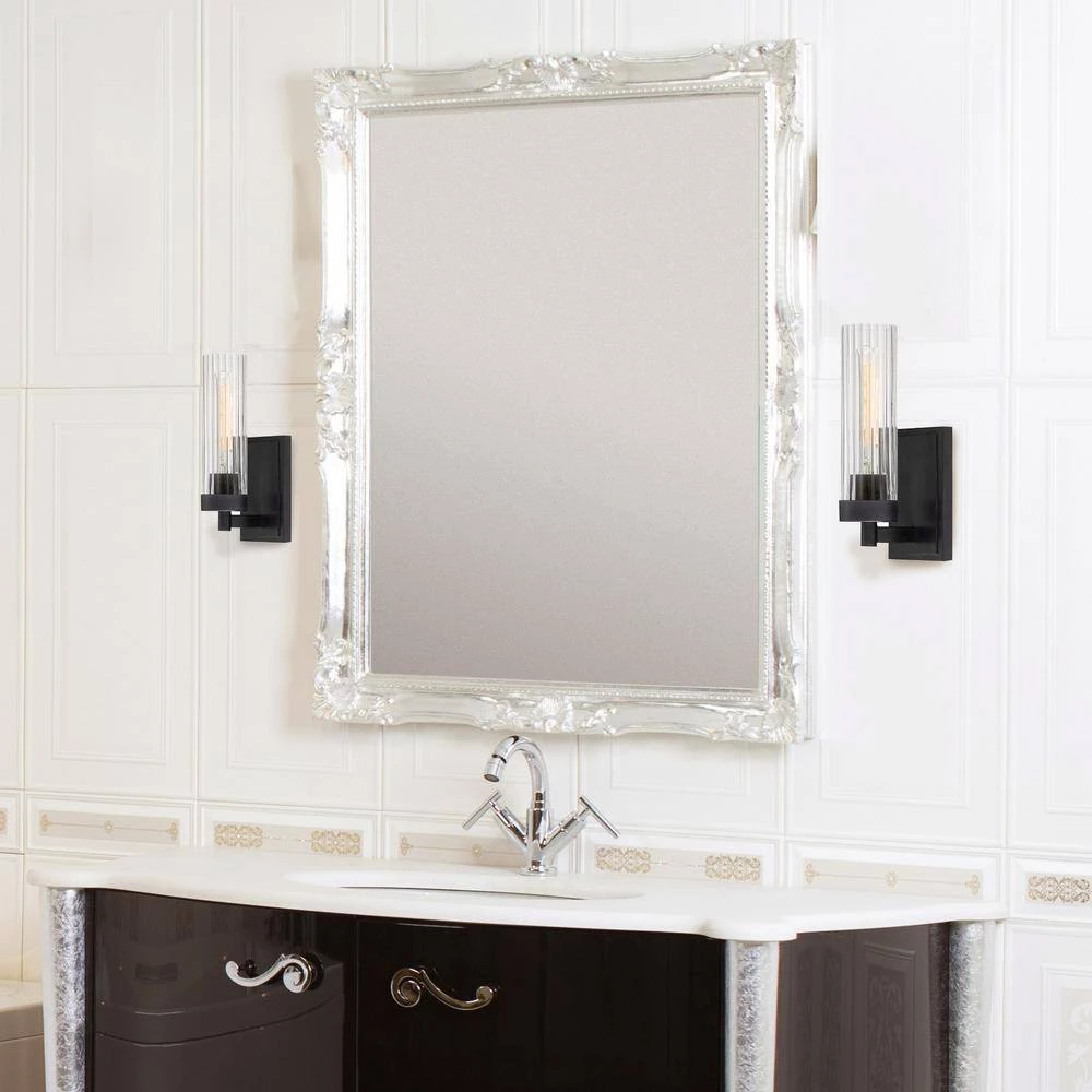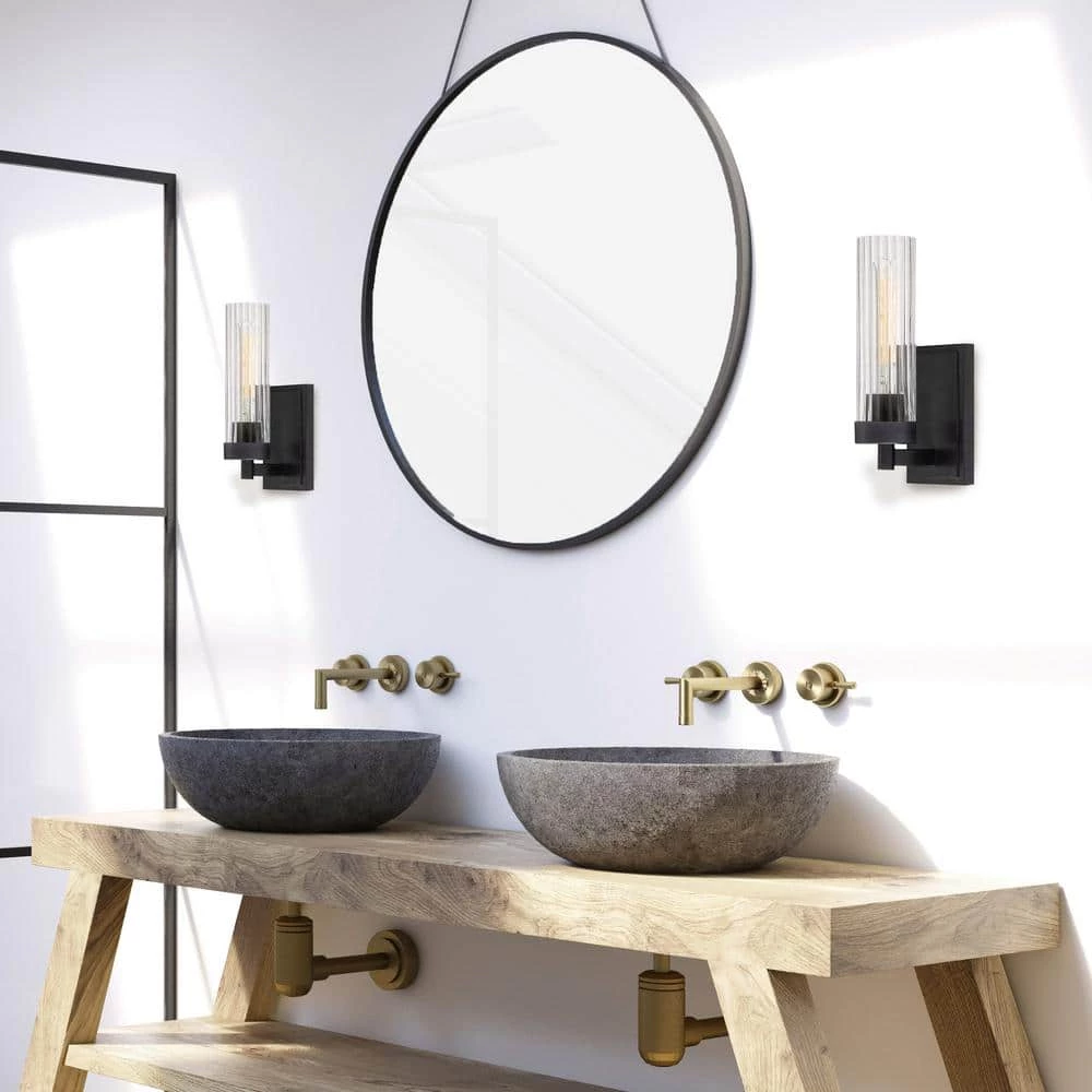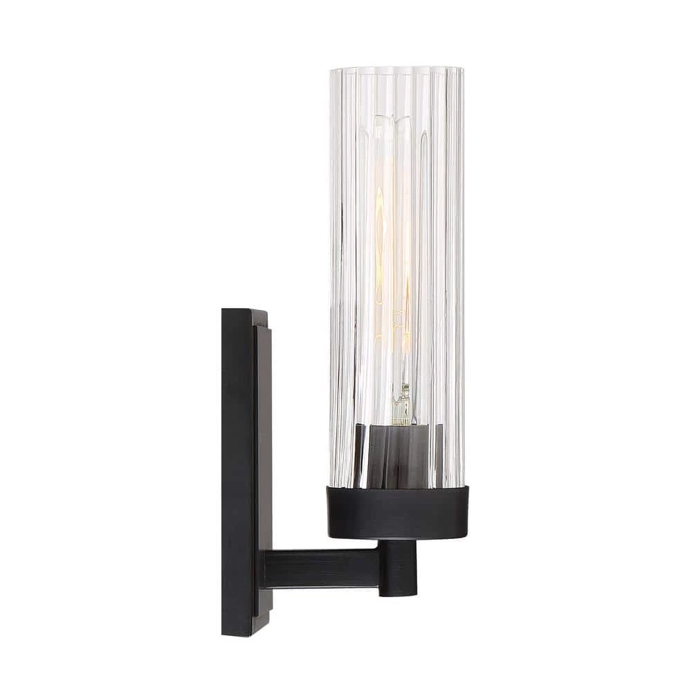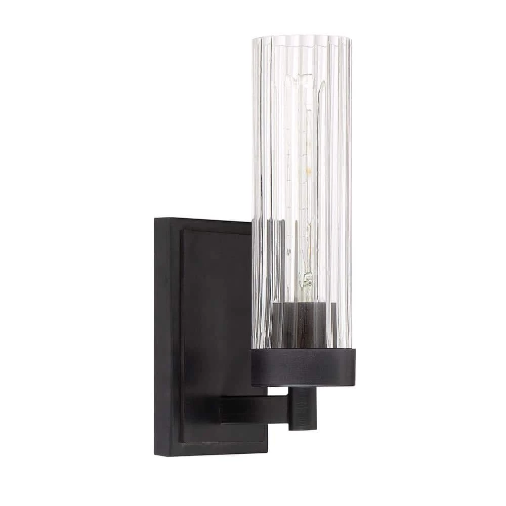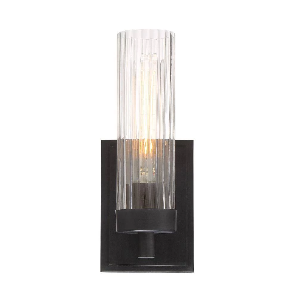- Iron graphic wall sconce with clear ribbed glass shade ideal for today’s interiors