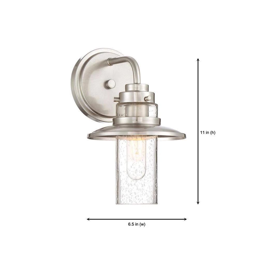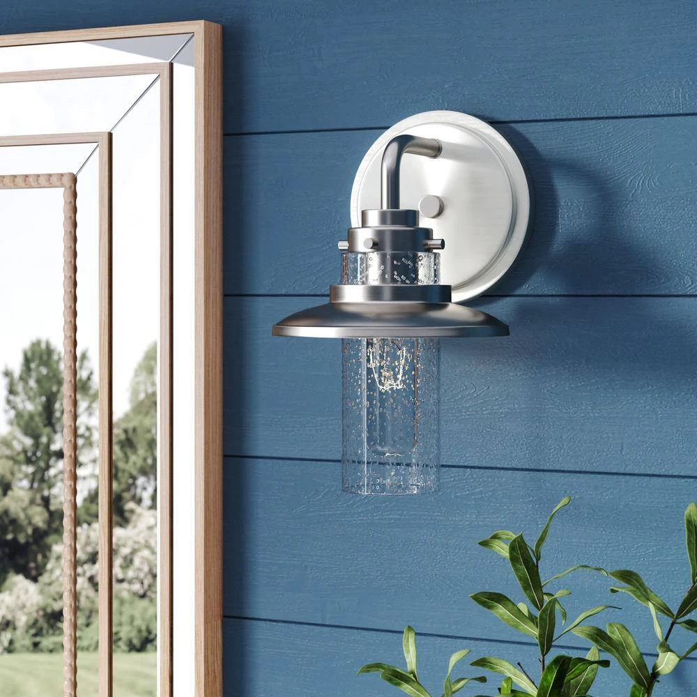 The Dover collection redefines farmhouse luxury while retaining farmhouse charm. With its satin platinum finish and clean lines, this wall sconce will be the star of your wall. The clear seedy shade highlights the vintage style bulb and creates a unique pattern of light around the fixture. These wall lights are designed for damp locations such as over sinks in bathrooms and vanity areas. Sconces are perfect next to artwork in hallways or on display walls.
