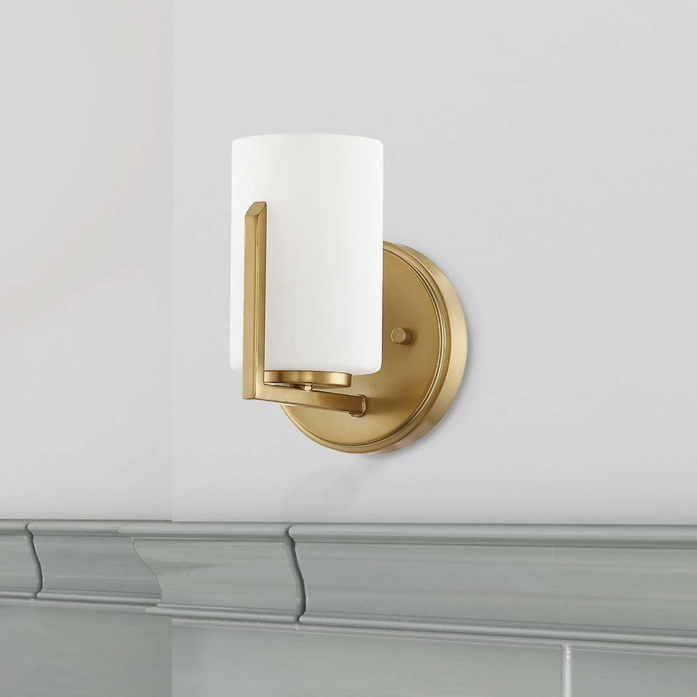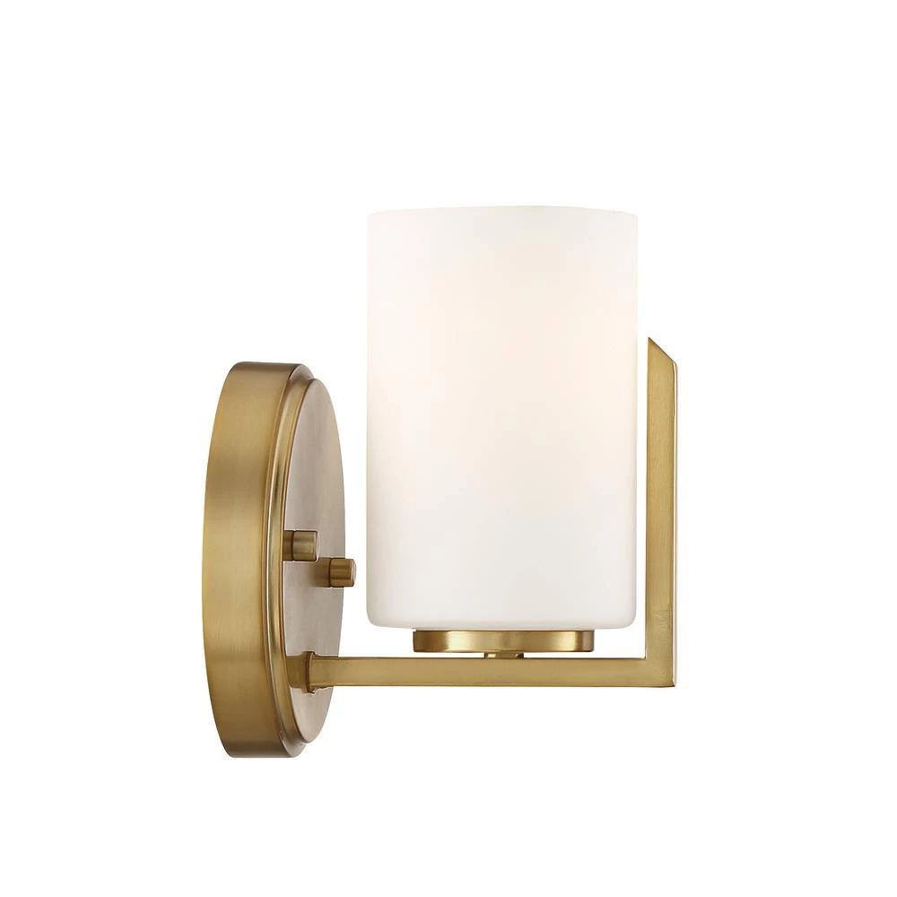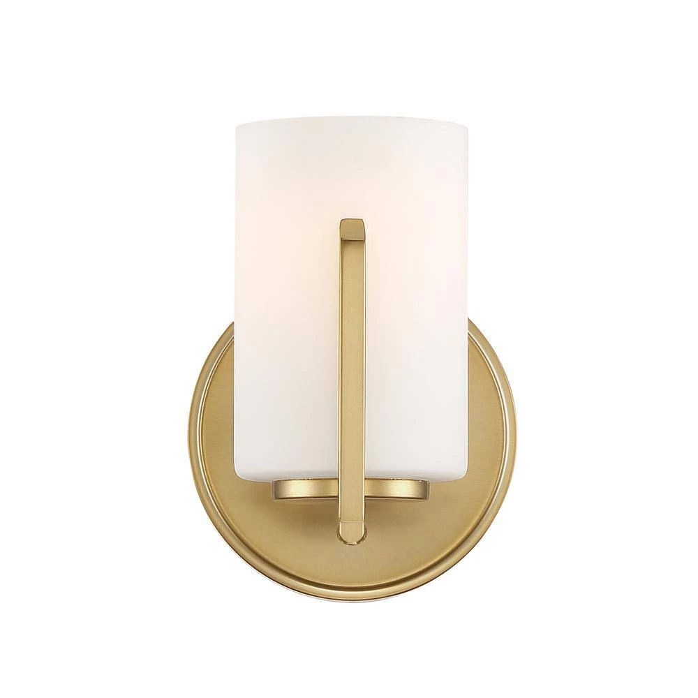 - Brushed gold wall sconce with etched opal glass shade ideal for today’s interiors