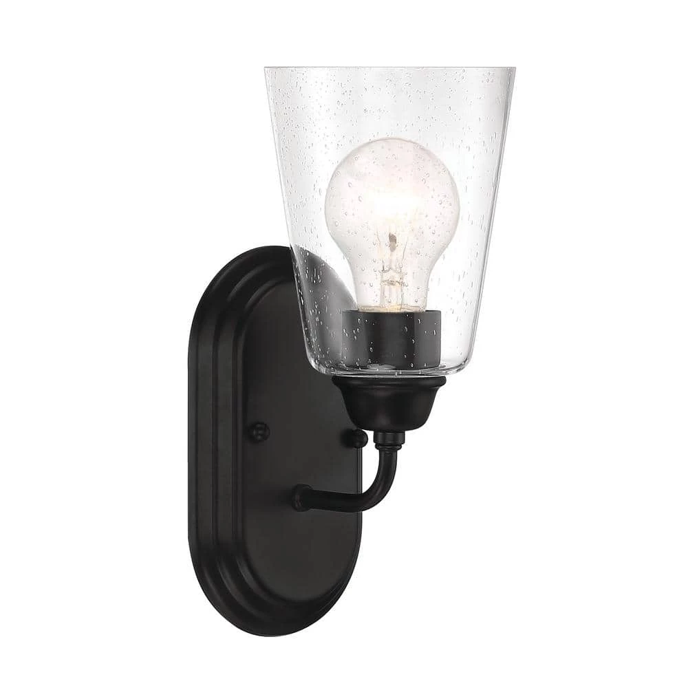 - Matte black 1-light wall sconce with clear seedy glass is part of the Zane collection
