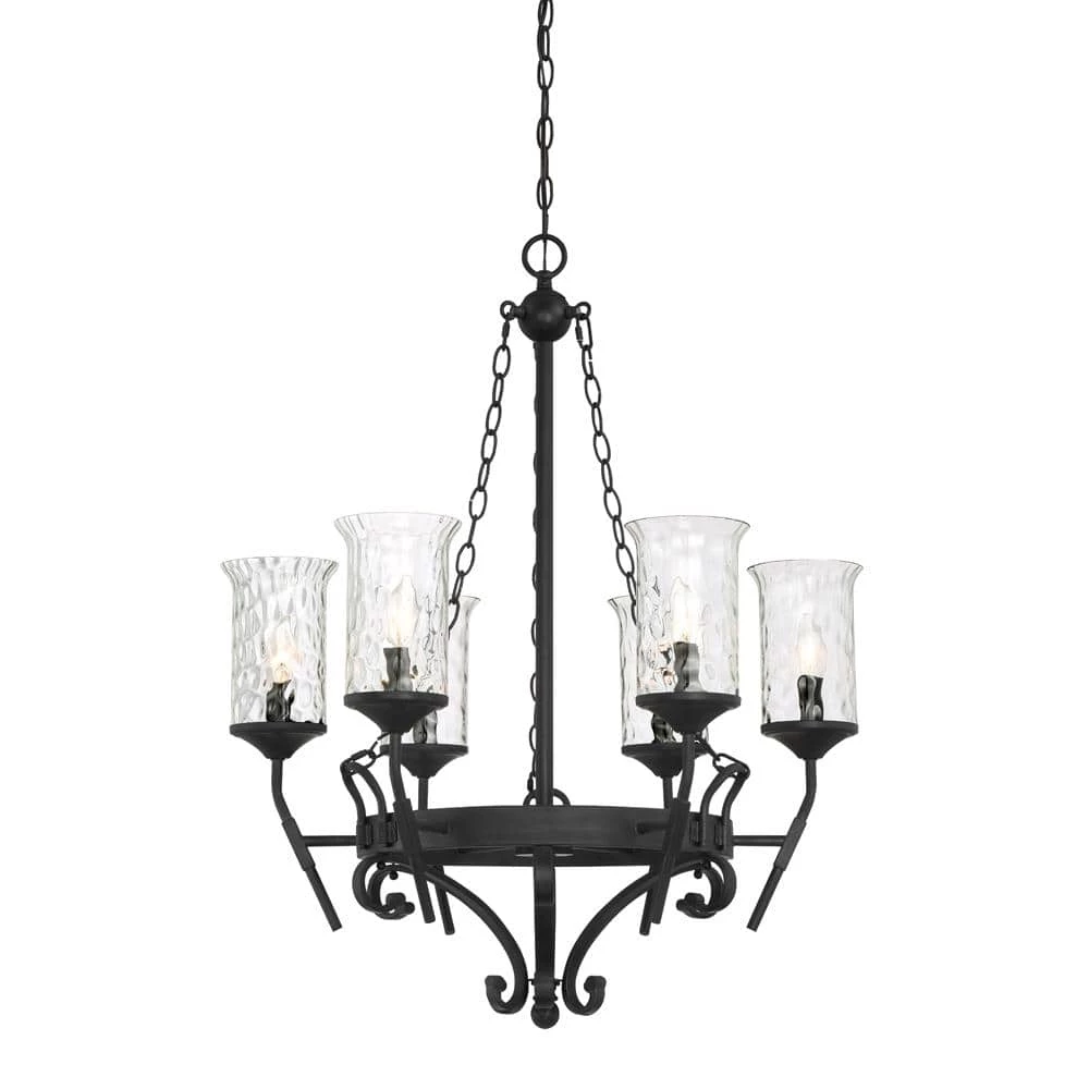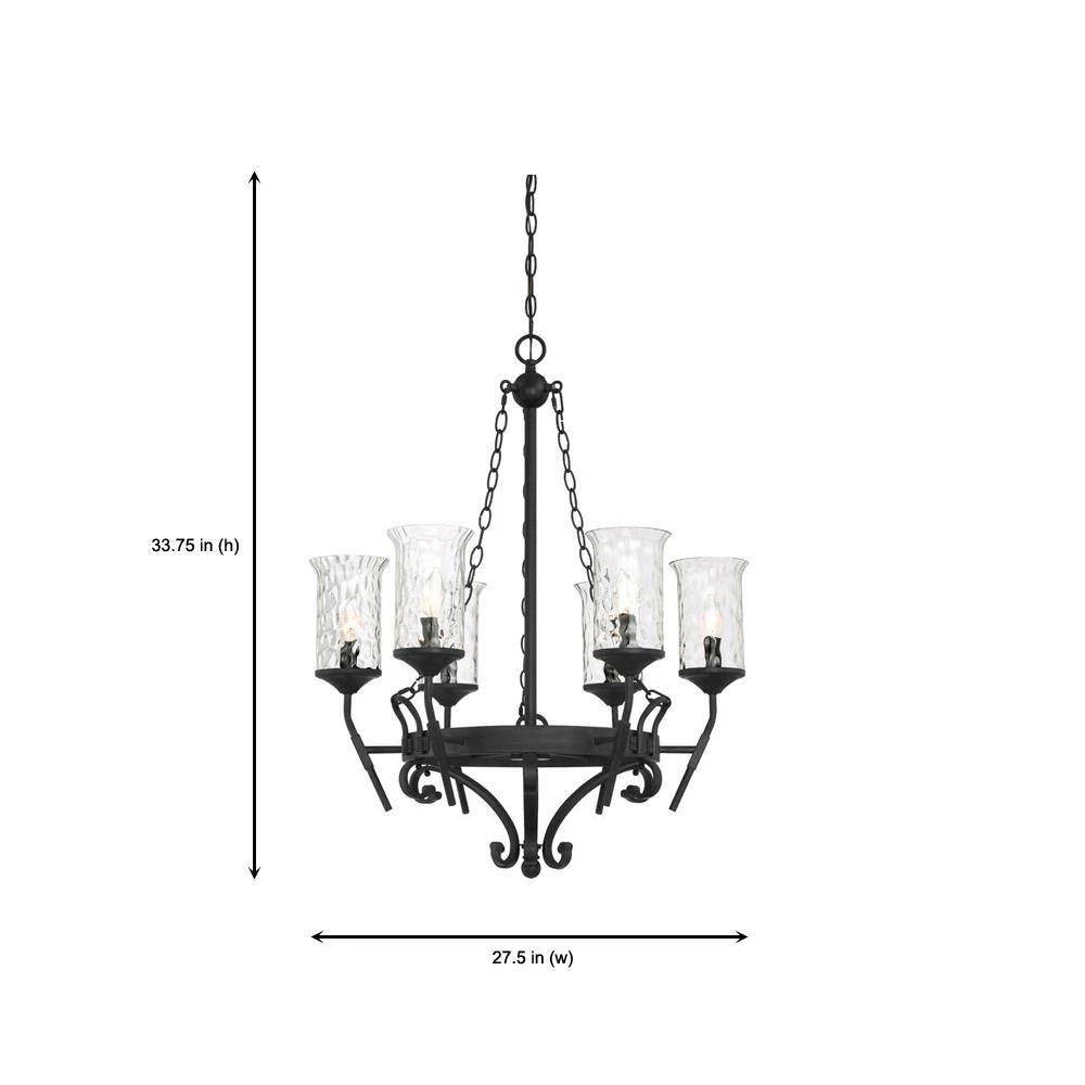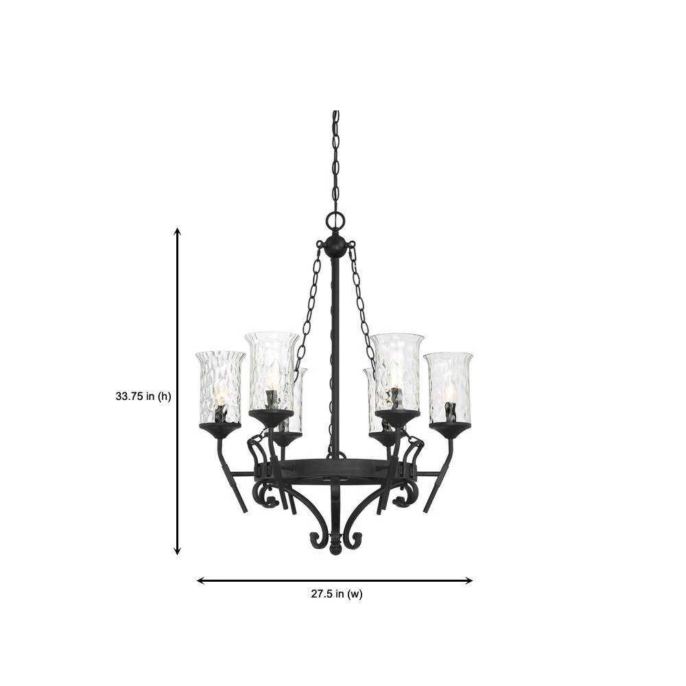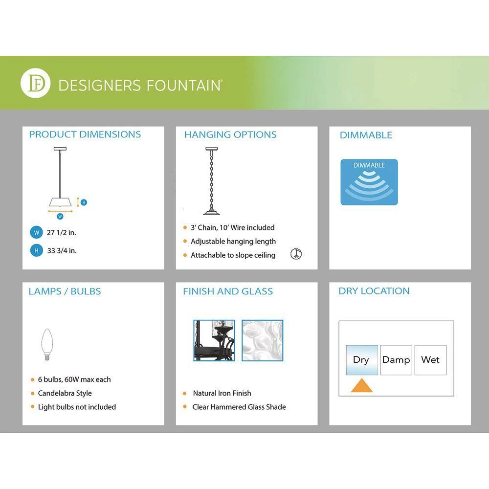 A relaxed sense of rustic elegance. The Amilla collection is offered in a rich hand painted Natural Iron finish with blown clear hammered glass. With its rustic iron finish and unique accents, this ceiling chandelier will be the star of your room. The hammered glass shades create an elegant pattern of light. This chandelier is designed for dining areas, nooks, sitting areas, living rooms and larger bedrooms, and it can be mounted on a sloped ceiling.