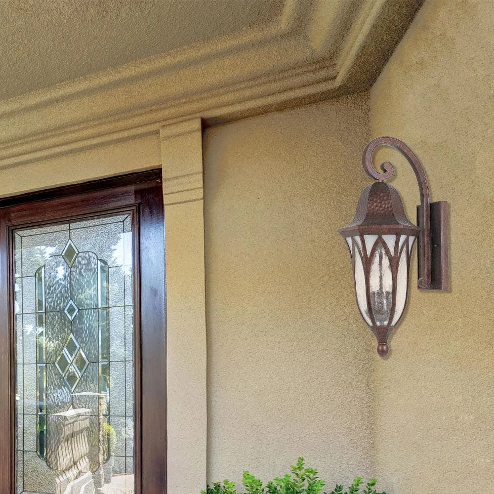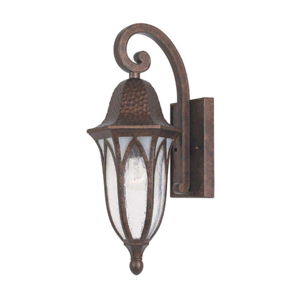 Charleston outdoor lanterns are specially designed with a unique, lavish style that complements the exterior decor of any home. This collection features vaulted arch style glass panels and boldly scrolled cast arms. The burnished antique copper finish over distressed hammered detailing adds a rustic look to the fixture. The clear seedy glass panels and frosted seedy glass trim enhances the appearance and provides a warm glow from the light. The sturdy, weather resistant cast aluminum construction and waterproof seal protects the lantern from harsh outdoor elements to ensure the long life of the fixture. These outdoor lanterns install easily and deliver welcoming, safe and reliable exterior lighting.