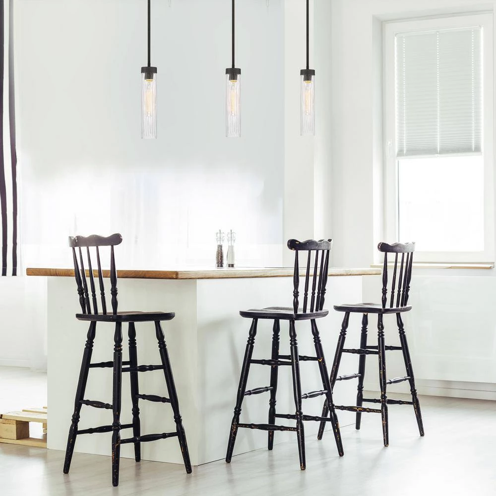 - Iron graphic mini pendant with clear ribbed glass shade ideal for today’s interiors