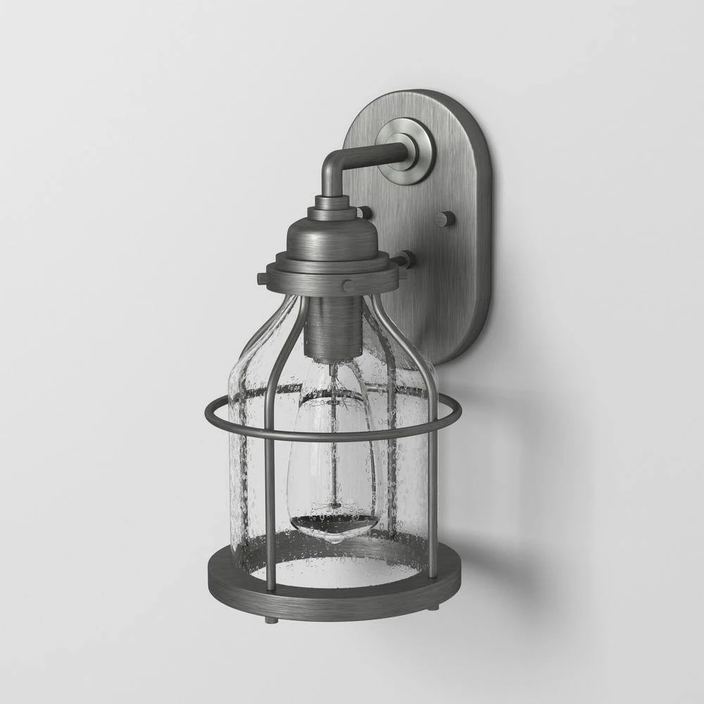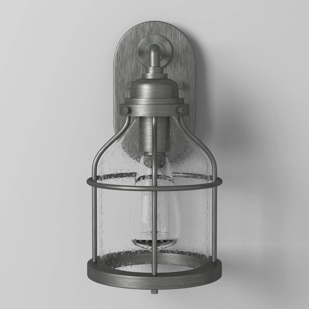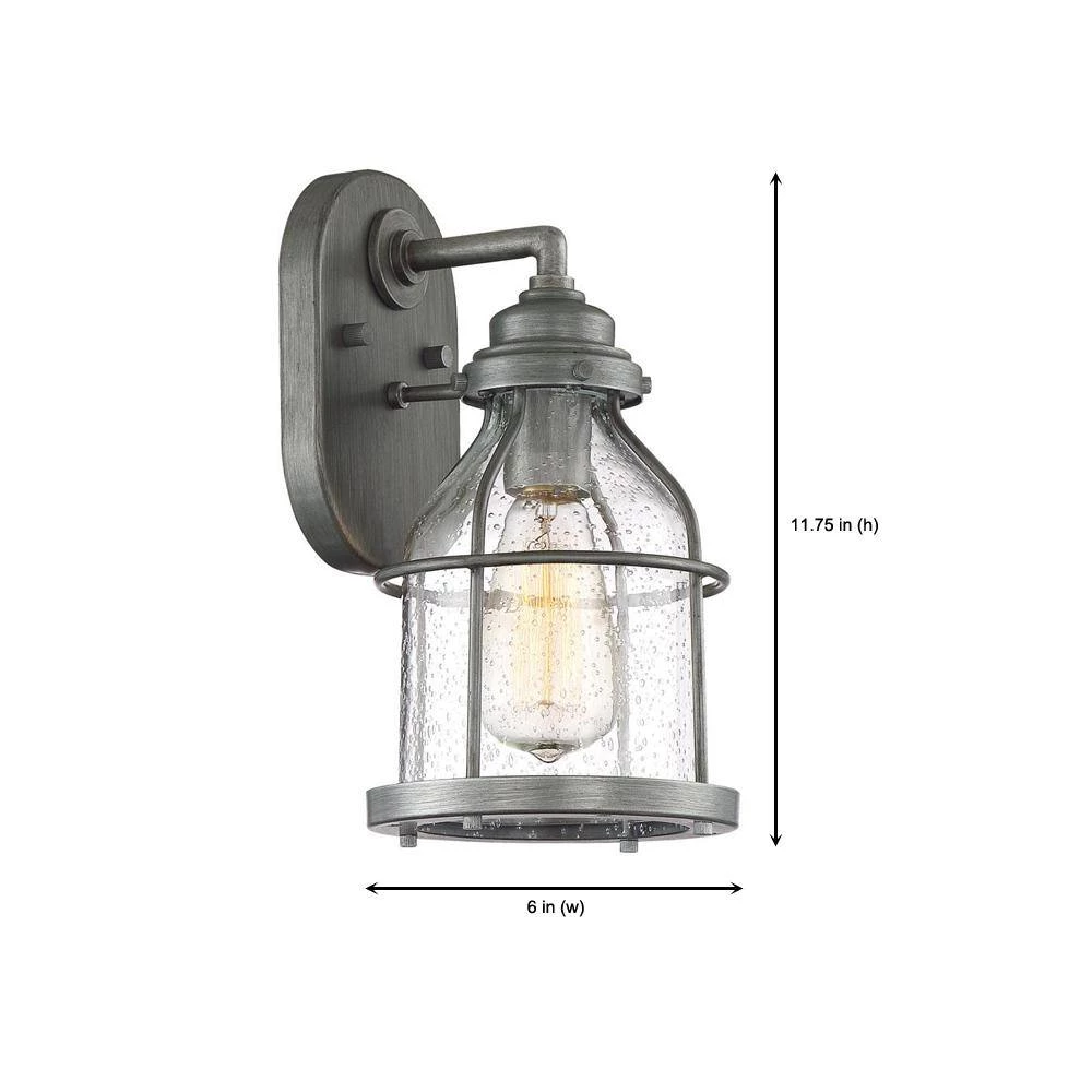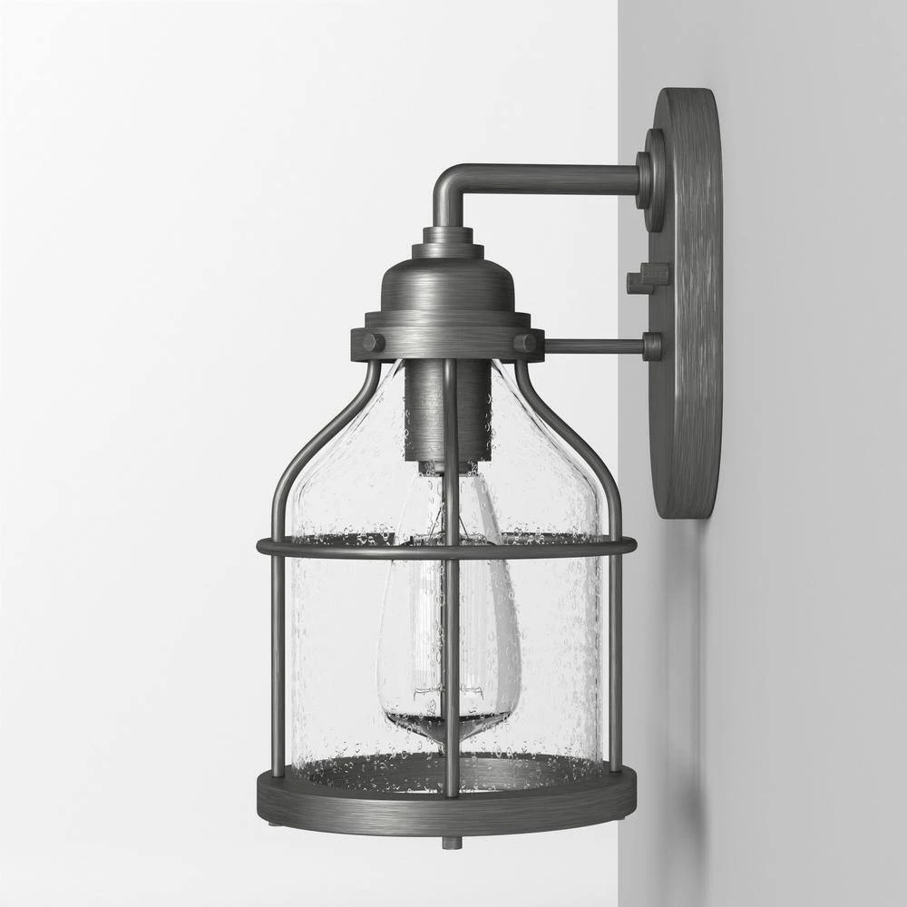 Elevate your outdoor space with this Brensten 1-light outdoor wall lamp. Great for your exterior walls and doorways, it offers an open-cage design, clear seedy glass and a weathered iron finish for a sophisticated look. It comes with hardware for an easy installation.