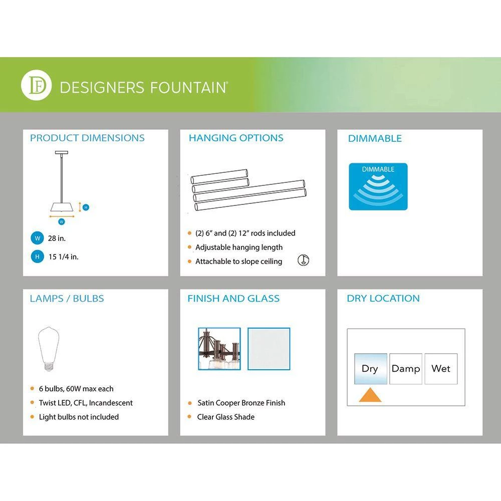 - Uses 6-light bulbs, not included