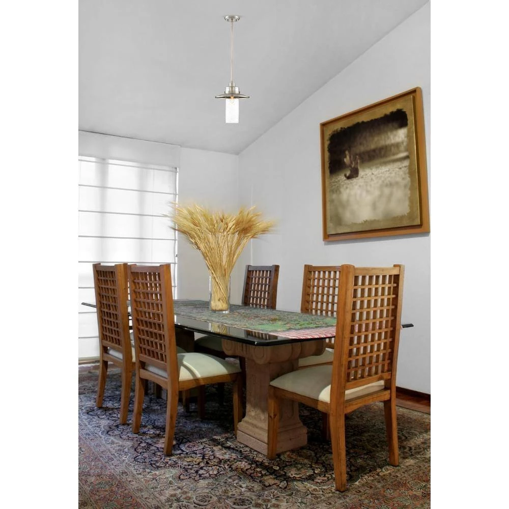 The Dover collection redefines farmhouse luxury while retaining farmhouse charm. With its satin platinum finish and clean lines, this hanging pendant light will be the star of your room. The clear seedy shade highlights the vintage style bulb and creates a unique pattern of light around the fixture. This hanging pendant is designed for dining areas, nooks, sitting areas, living rooms and larger bedrooms, and it can be mounted on a sloped ceiling .