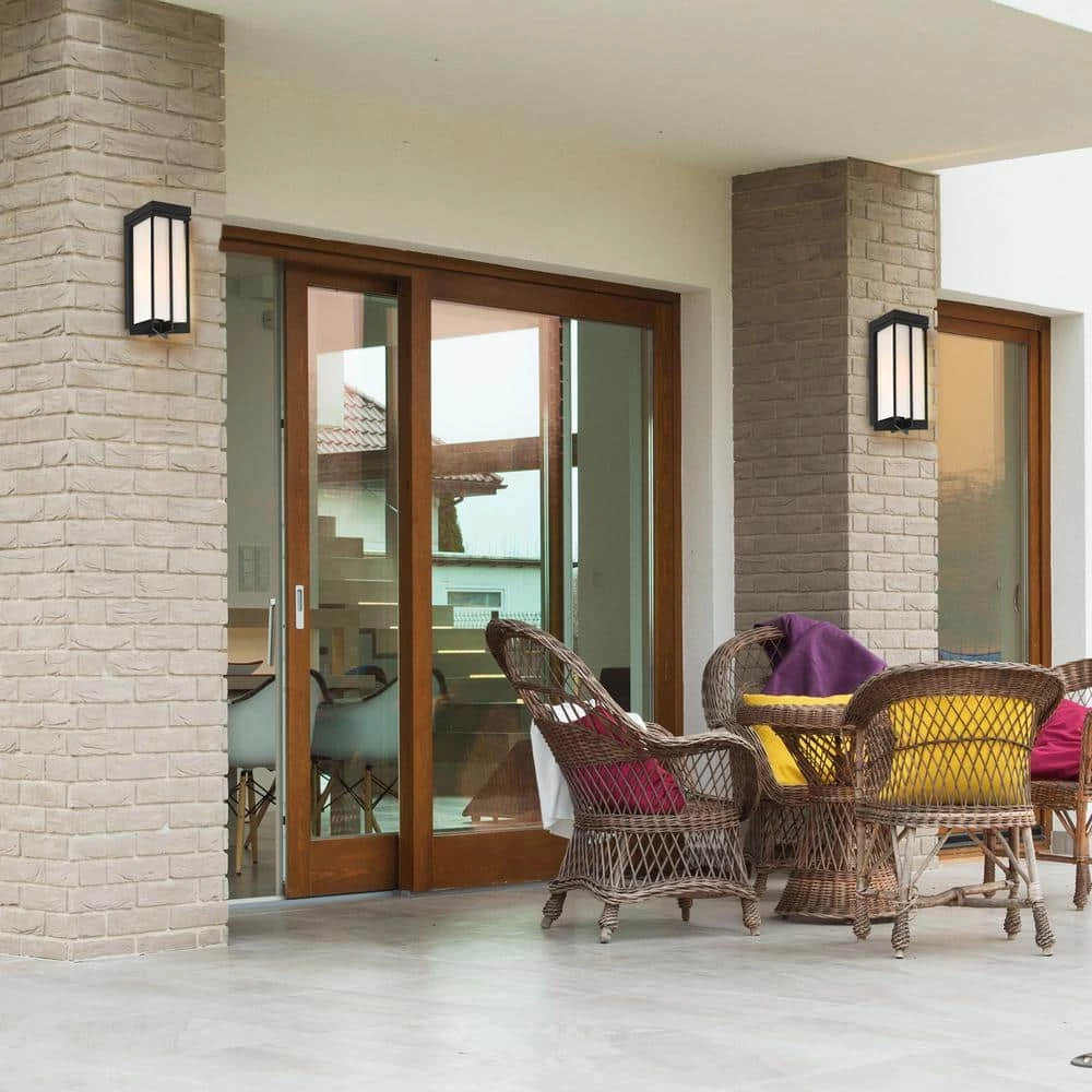 - Matte black LED wall lantern with etched white glass panels is part of the Eads collection