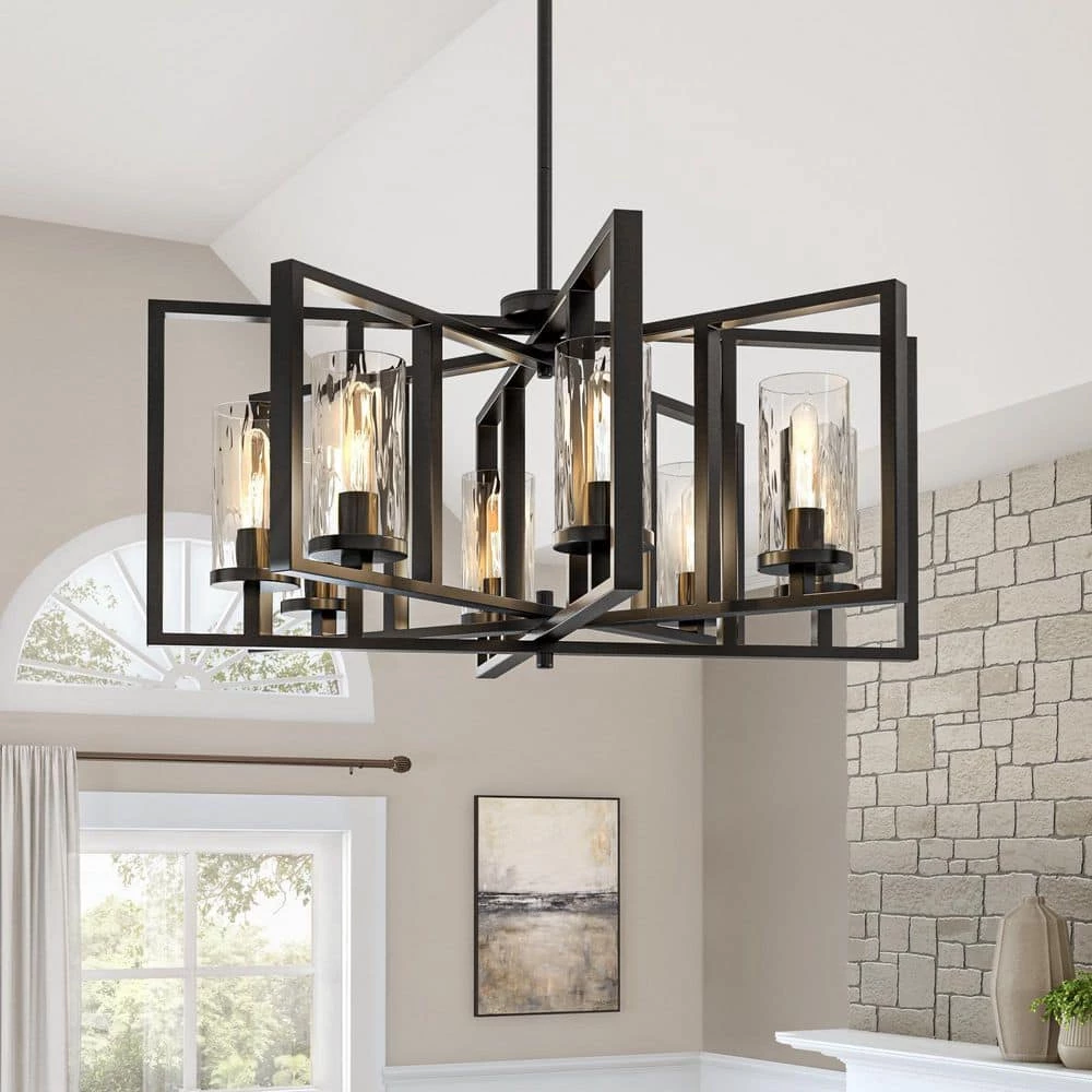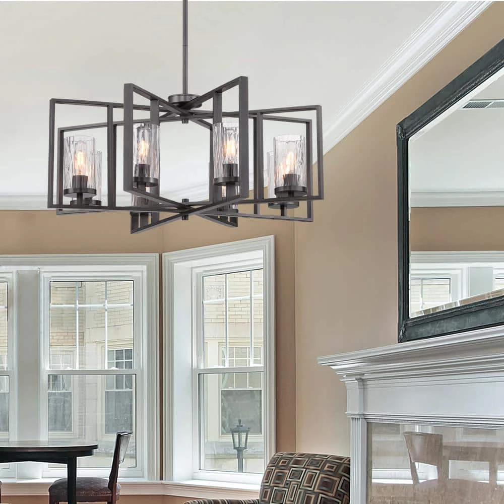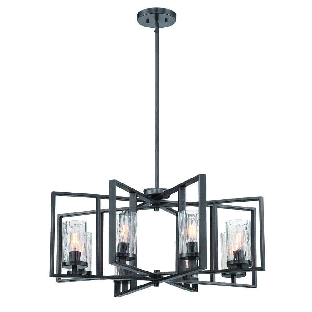 The Elements Collection comes in Charcoal with Rain glass. This Transitional Elements 8 Light Chandelier will complement the decor in any room of your home. Made with solid steel construction to look great and last for years to come.
