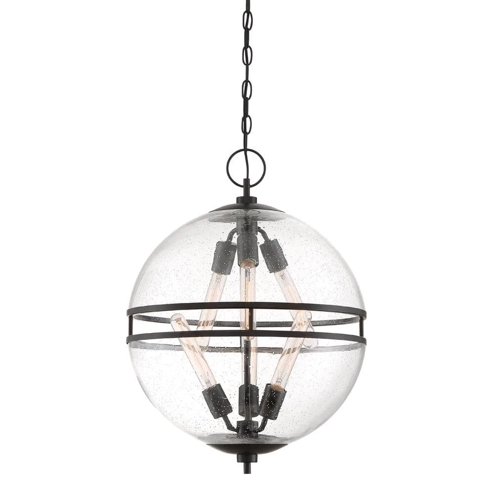 Hollywood Hills – the beauty is in the details. This Mid-Century Modern motif combines a deep Matte Black finish and blown Seedy Glass with an open center allowing for a smart peek-a- boo effect. To further the interest, a hip configuration of the bulbs allows for Modern and Industrial applications. This fixture uses 6 screw-based bulbs, a filament T10 style lamp is recommended.