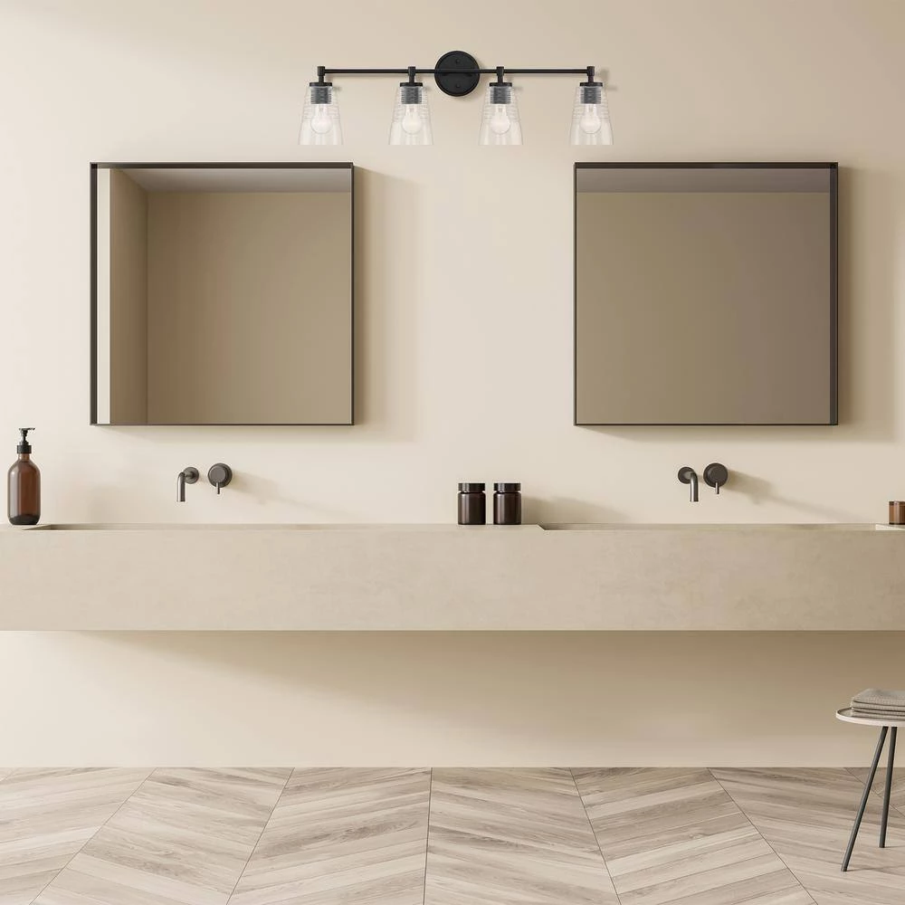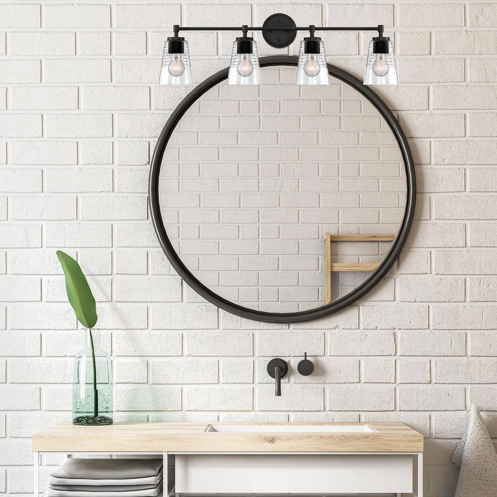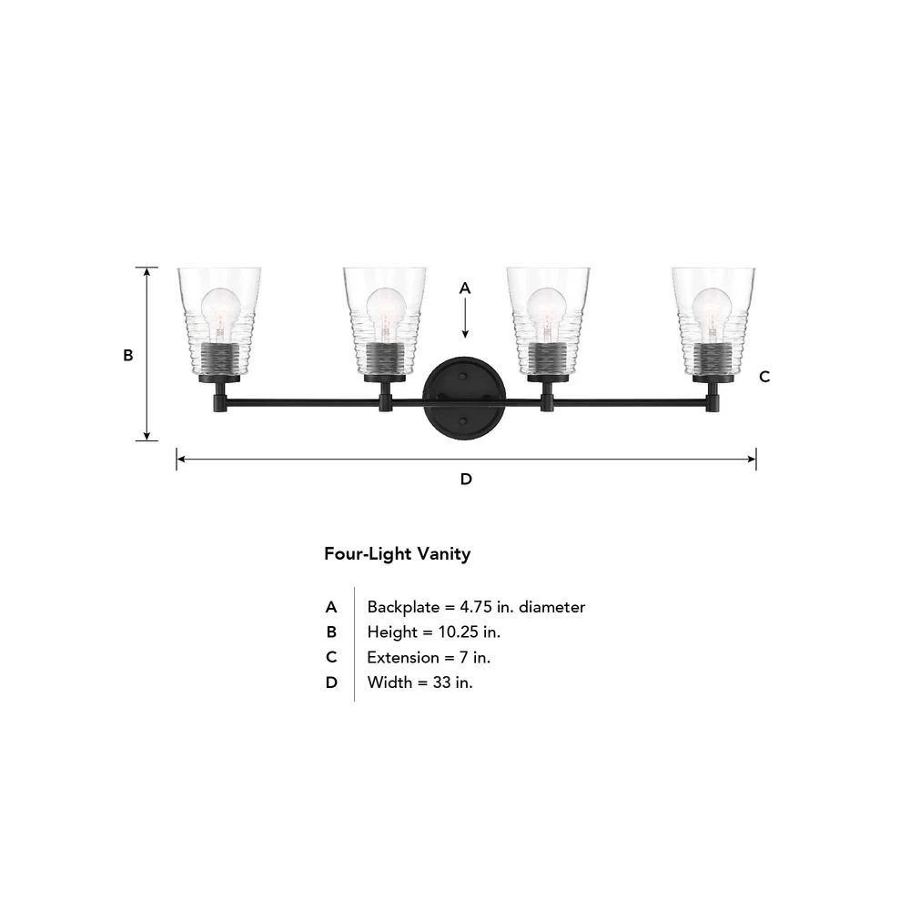 - Matte black 4-light vanity with clear blown ripple glass is part of the Ingo collection