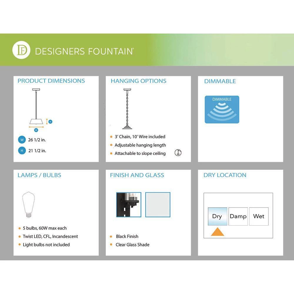 - Uses 5 light bulbs, 60-Watt max per socket