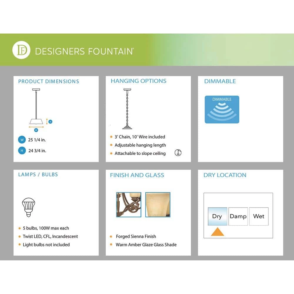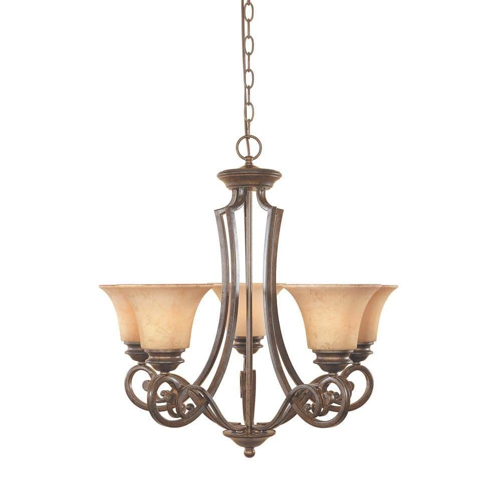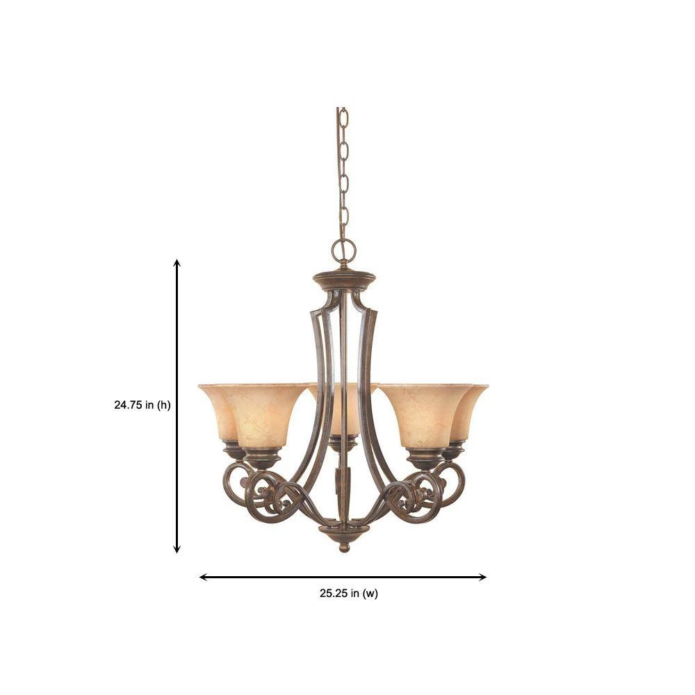 Vienna decorative chandeliers are specially designed with a unique style to complement the interior of any home. This collection features a forged sienna finish over clean lines and double scrolled arms that give a bold stylish look to the fixture. The warm amber glaze glass shades add elegance and a warm, welcoming diffuse to the light. The durable steel construction ensures that this chandelier will continue to perform well and look great for years to come. These fixtures come with a 3 ft. decorative chain for easy installation.