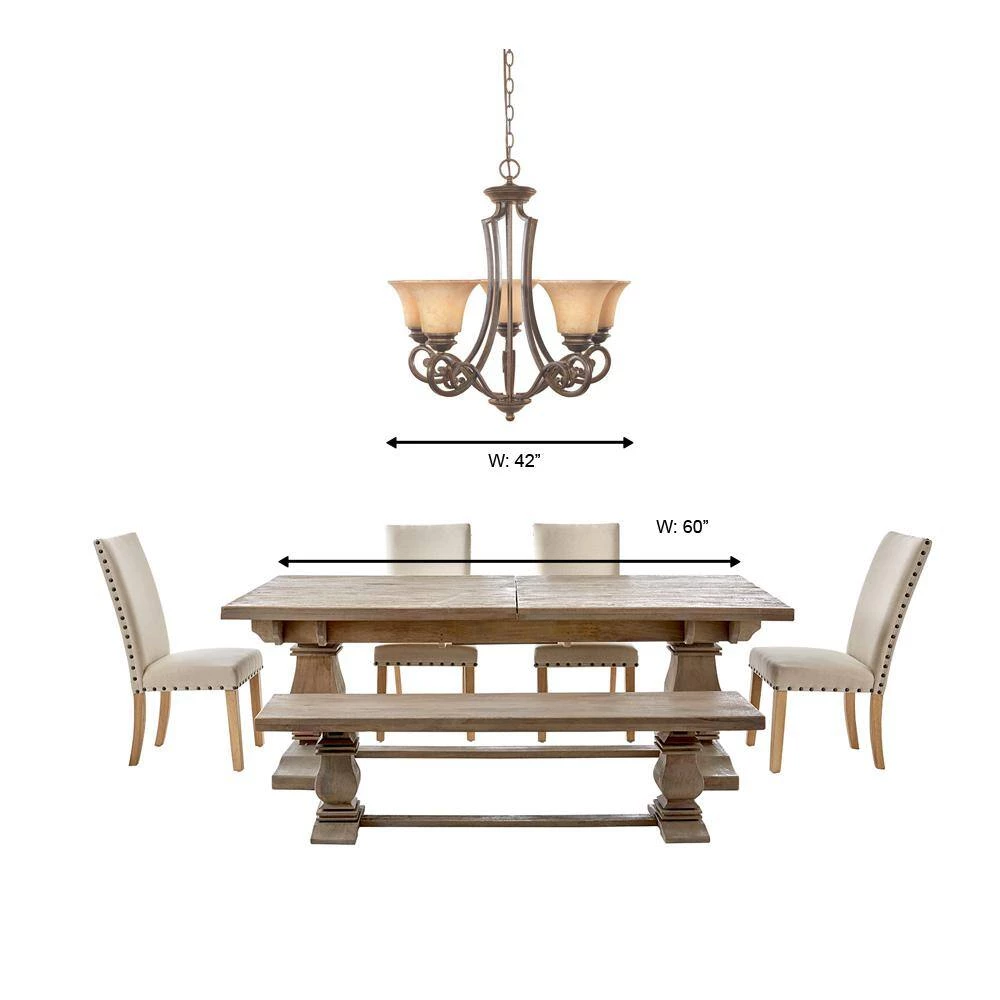 - Design features double scrolled arms, forged sienna finish and warm amber glaze glass shades