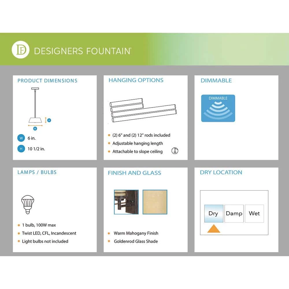 Mission Hills ceiling mounted mini pendants are a modern take on a beautiful, classic mission style design that features bold lines and striking details. The warm mahogany finish and goldenrod glass shade adds sophistication to the fixture and a warm diffuse to the light. These mini pendants are built from steel, last for years to come, and install easily.