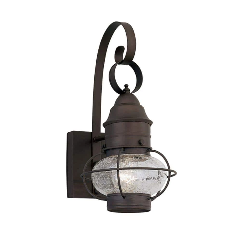 Cork outdoor lanterns feature a simple, classic design with a unique style that complements the exterior decor of any home. The clear seedy glass works with the bold scrolled arm and square back plate to provide a rustic look from the fixture and a warm glow from the light. The rustique finish is treated to prevent pitting, tarnishing, corrosion, and discoloration. The sturdy, weather resistant steel construction and waterproof seal protect the lantern from harsh outdoor elements to ensure the long life of the fixture. These outdoor lanterns install easily and deliver welcoming, safe and reliable exterior lighting.