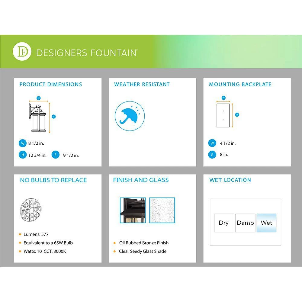 The Piedmont Collection comes in Oil Rubbed Bronze with Clear Seedy glass. This Transitional Piedmont 8 in. LED Wall Lantern will complement the decor in any room of your home. Made with Cast Aluminum construction to endure harsh outdoor environments.