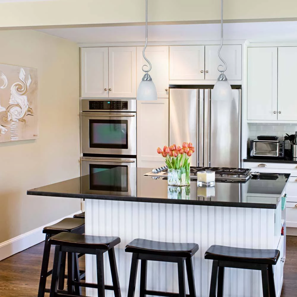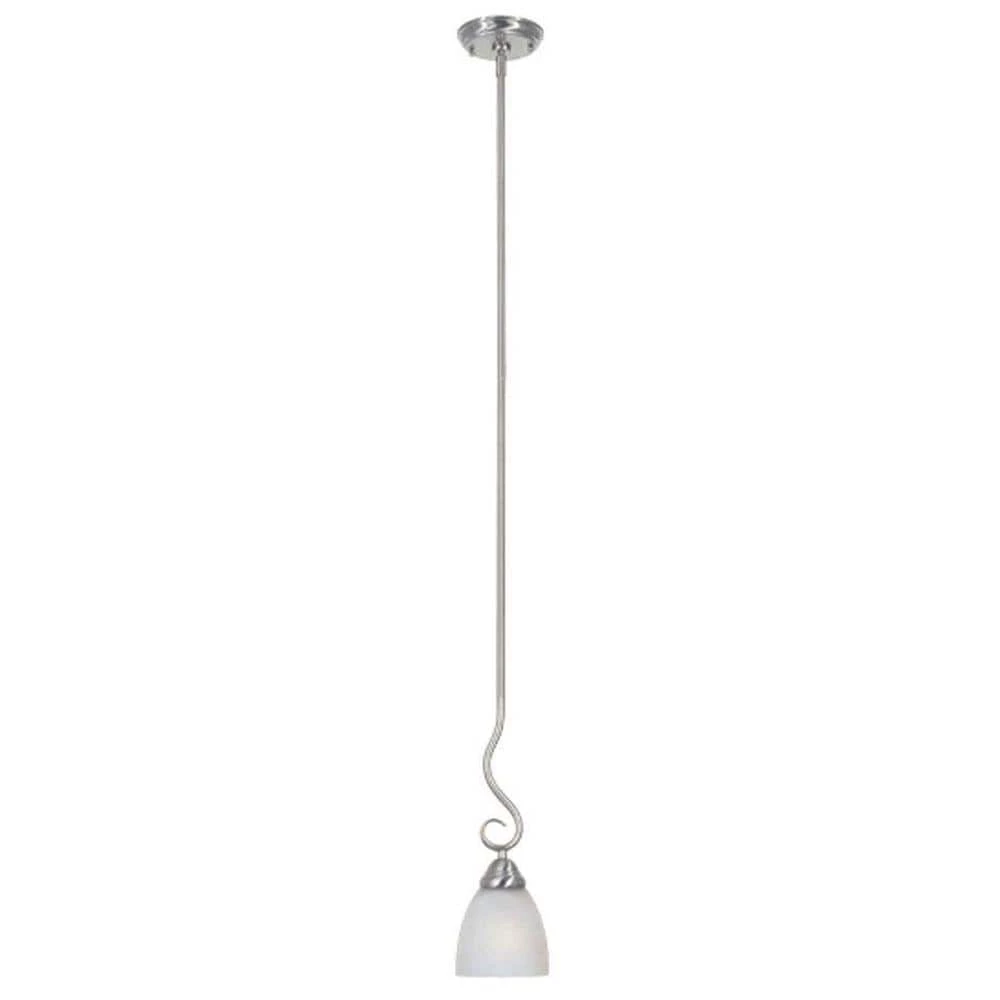 Bella Vista Collection pendants are designed with a unique, elegant, style that features scrolled lines, a detailed canopy, and curved glass. The satin platinum finish and faux alabaster shade completes this look and adds a warm diffuse to the light. These ceiling lights are built with steel to last for years to come, and they install easily.