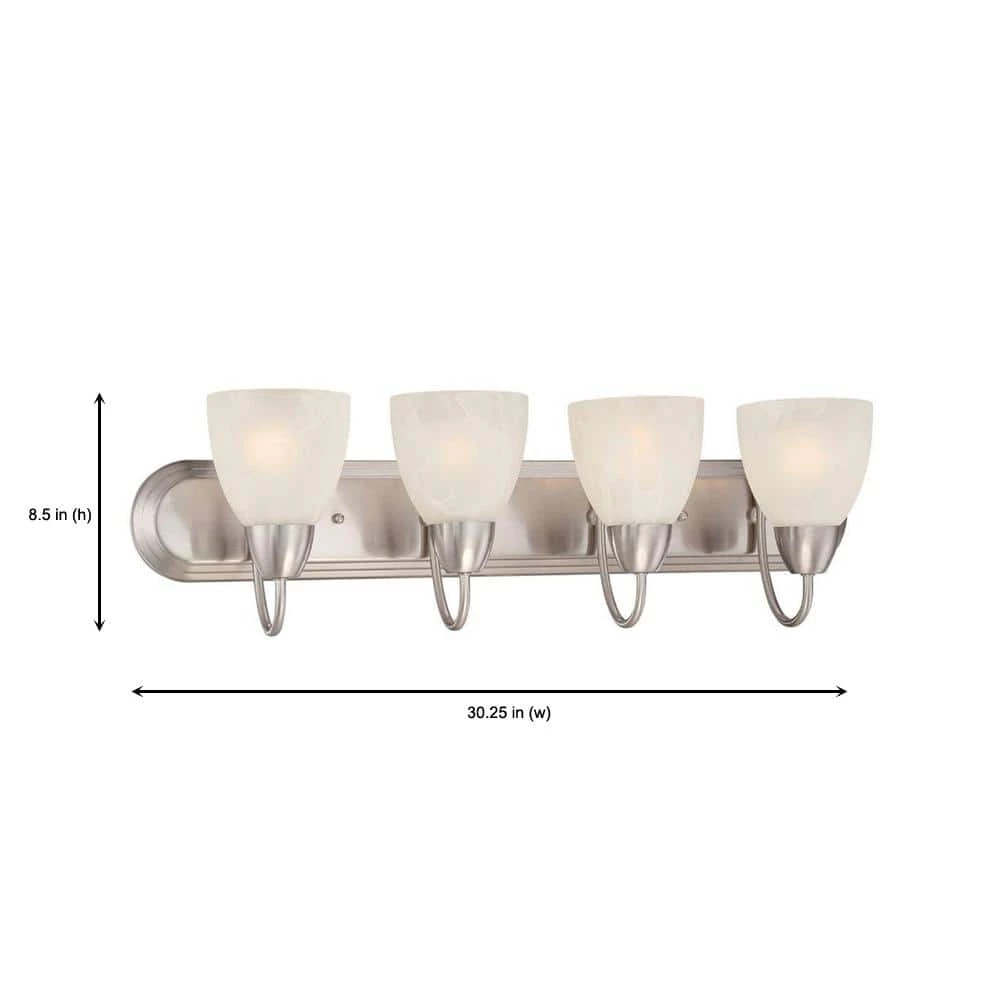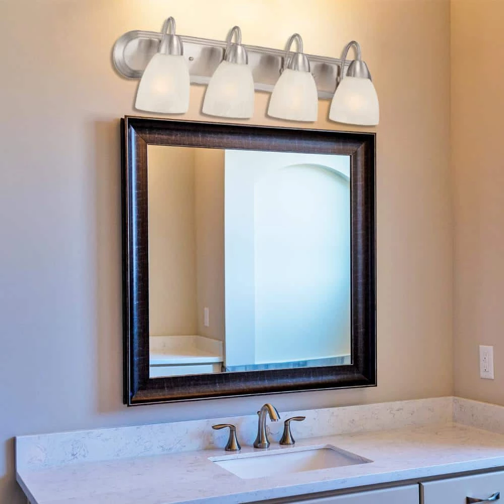 Torino bath bars feature a harmonious blending of traditional and modern styling, offering simplicity and timeless appeal with fresh, modern flair. These fixtures are built with a protective brushed nickel finish over a steel construction to look great and last for years to come. The alabaster glass shades add style and a warm diffuse to the light; they install easily in the up or down position.