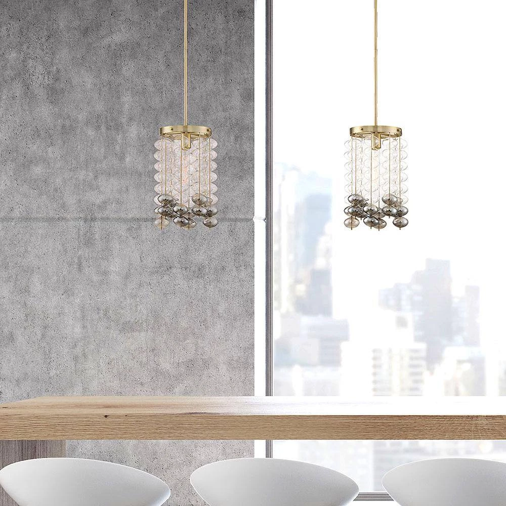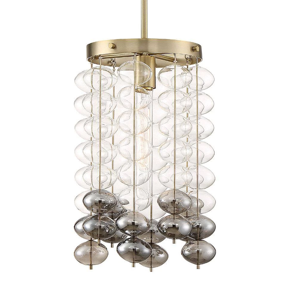 - Brushed gold finish with clear and smoked glass hanging accents